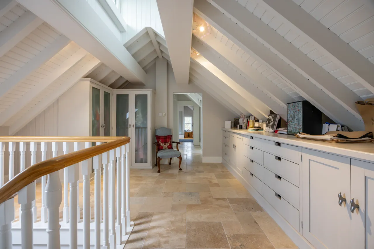 at widest points. Natural stone tiled floor. Eaves ceiling with exposed beam and feature roof lantern. Excellent range of built-in wardrobes, shelves, drawers and cupboard. Exceptional storage space. Door to...