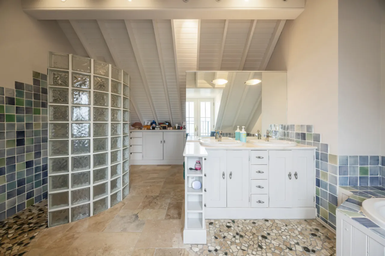 Feature deep fill panelled bath with centre taps and telephone hand shower and tiled splash back. Two wash hand basins with mixer taps and storage under. Bidet. Low flush WC with concealed cistern and marble trim. Open wet room style shower area with curved glass brick wall and tiled walls. Heated towel rail. Natural stone tiled floor. New England style ceiling.