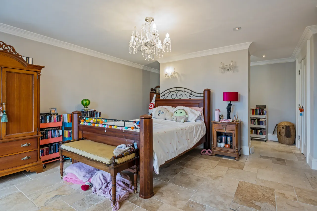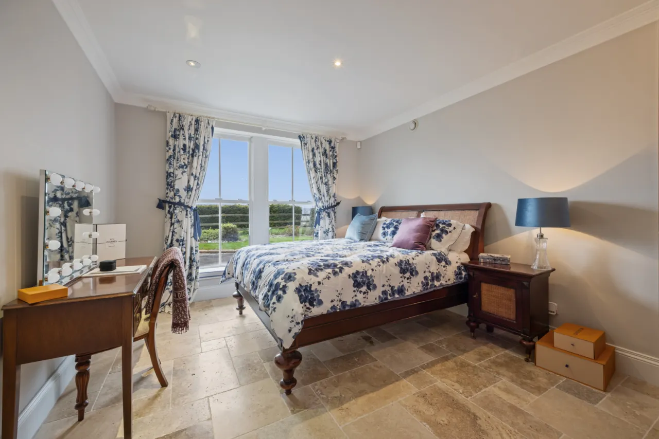 Living Area: Space for sofa and vanity changing area. Natural stone tiled floor. Double opening doors to crescent balcony overlooking front with fitted shutters.