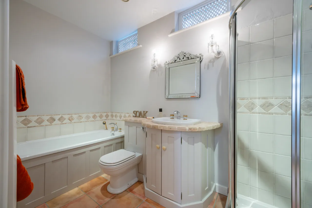 Low flush WC. Wash hand basin in vanity unit with built-in storage and open storage. Natural stone top and built-in mirror. Fully tiled walls. Stone tiled floor. Low voltage lighting. Wet room style shower with thermostatic shower.