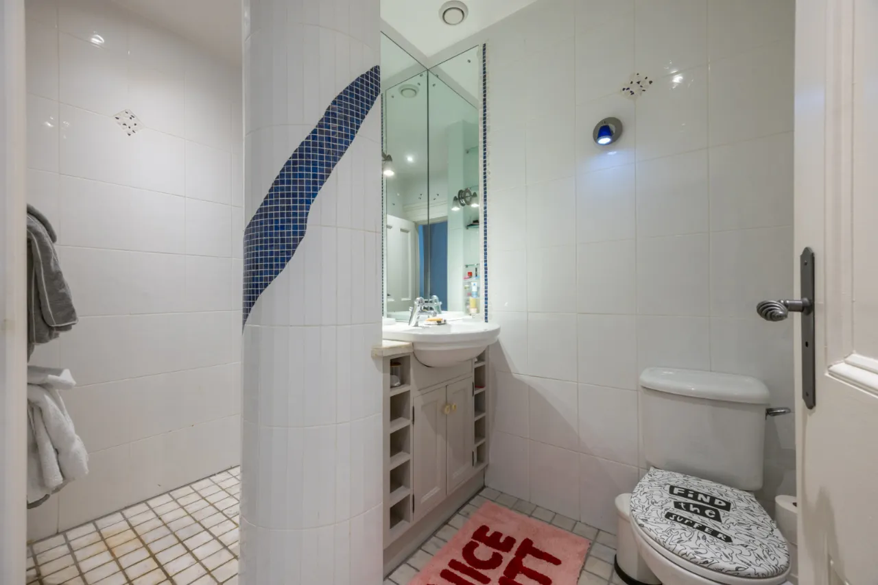 Fully tiled shower cubicle with thermostatic shower. Low flush WC. Pedestal wash hand basin. Light and power. Tiled floor.