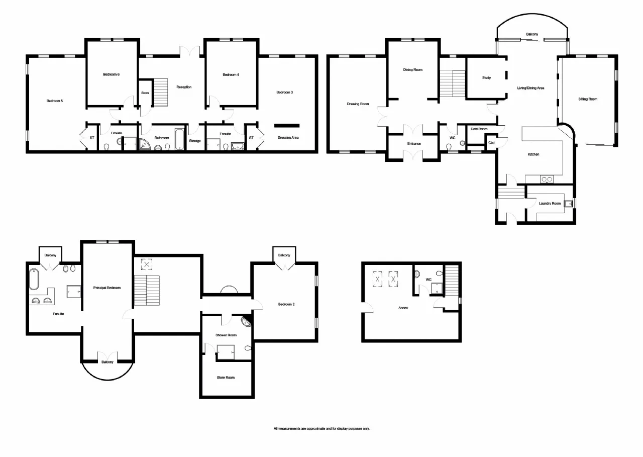 Dressing area with excellent selection of cupboards, drawers and shelves. Natural stone tiled floor. Open storage. Glazed display units. Access to..