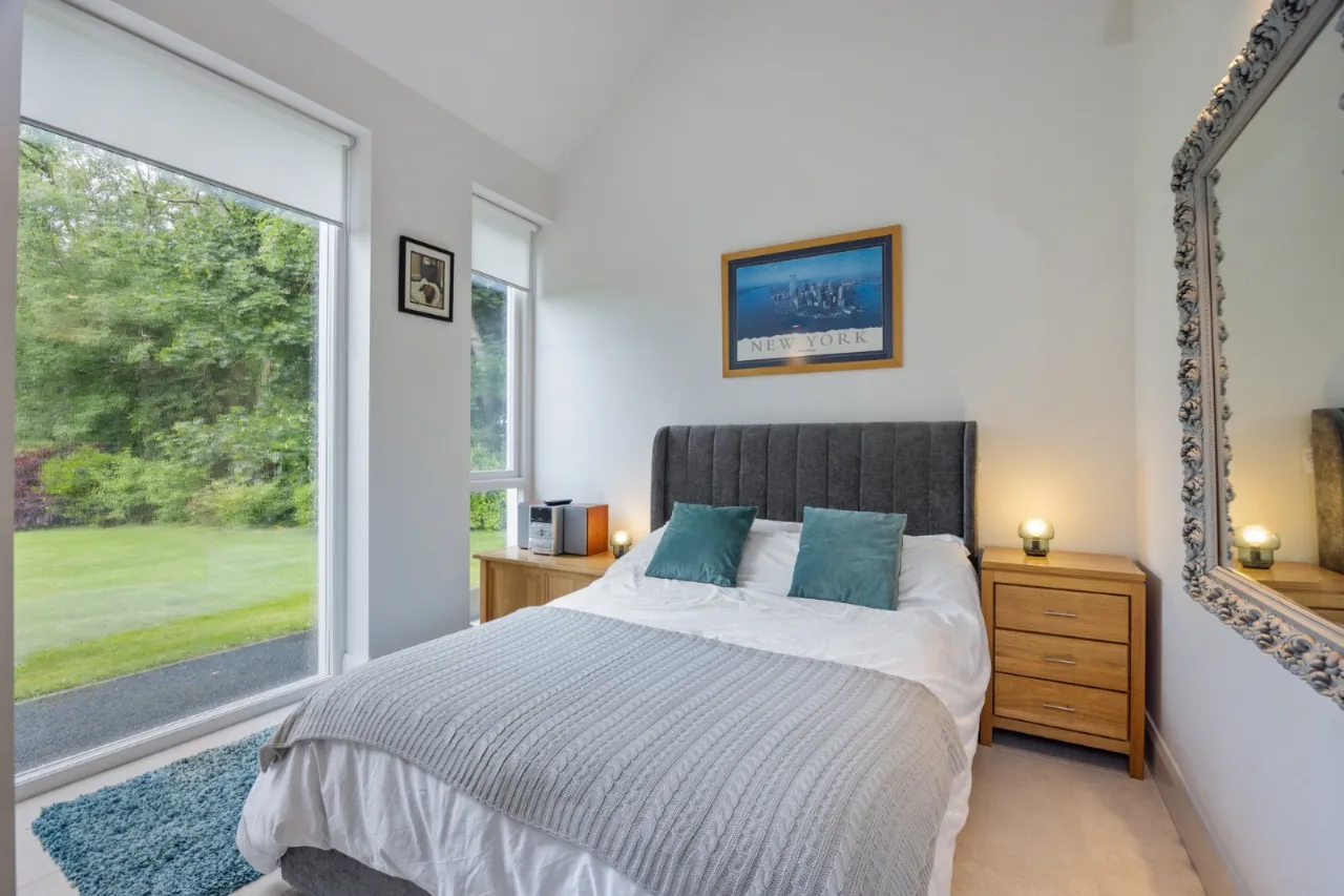 His and Hers' fitted wardrobes in sliding mirror panelled doors. Vaulted ceiling. Dual aspect windows with sliding patio door to garden. Cast iron, multi fuel stove on glass plinth. Tiled floor.