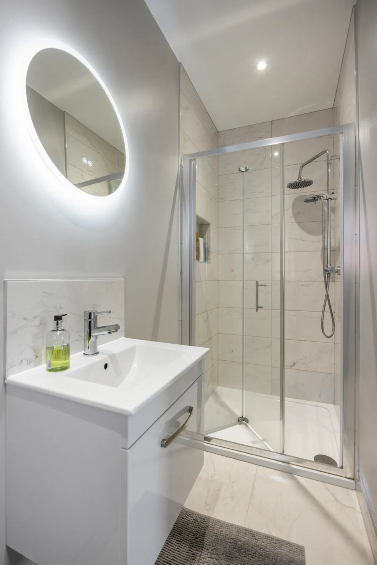 Comprising: Low flush WC, pedestal wash hand basin, fully tiled shower cubicle with chrome thermostatic shower unit, ceramic tiled floor, extractor fan, low voltage spotlights.