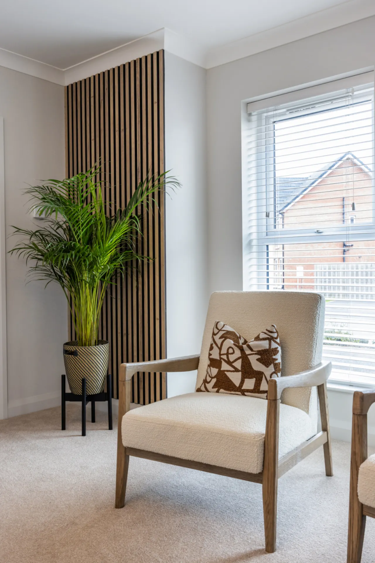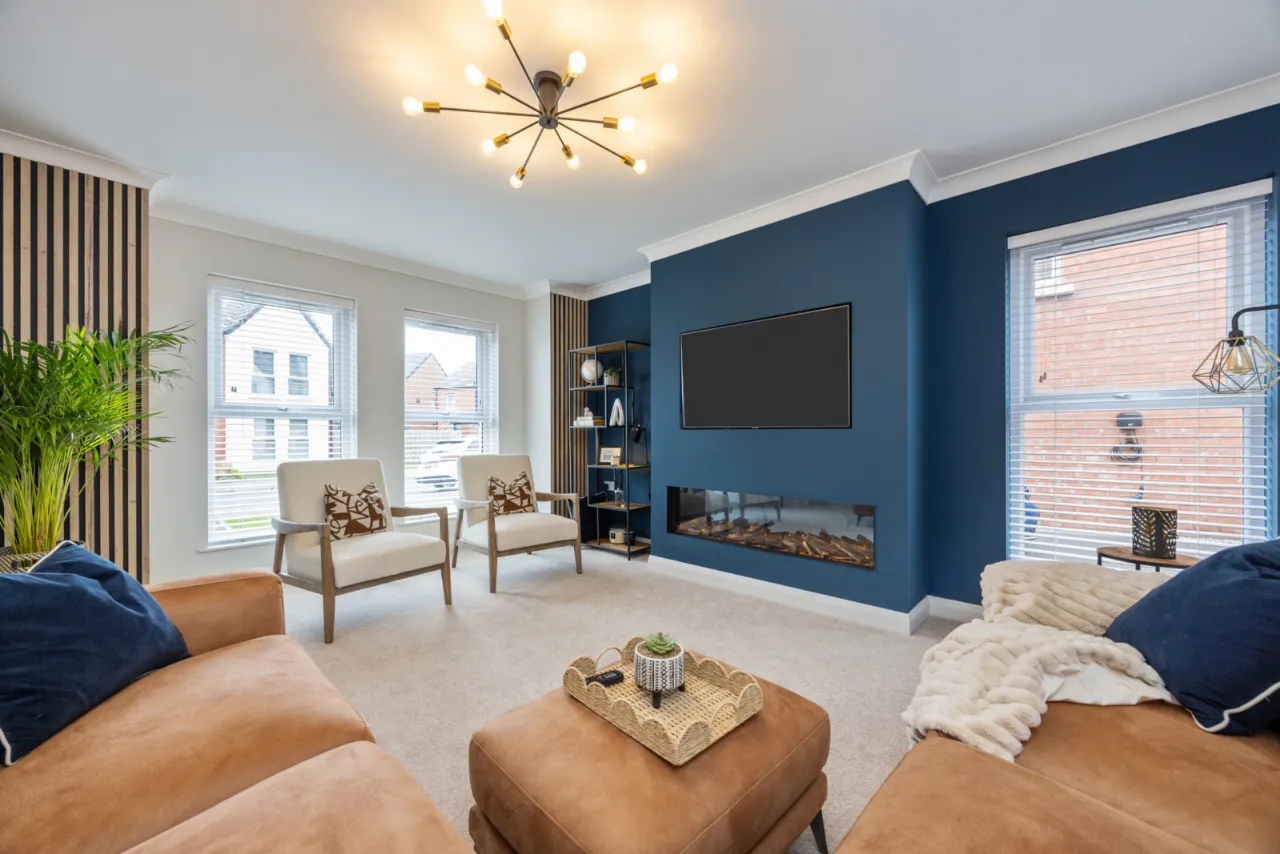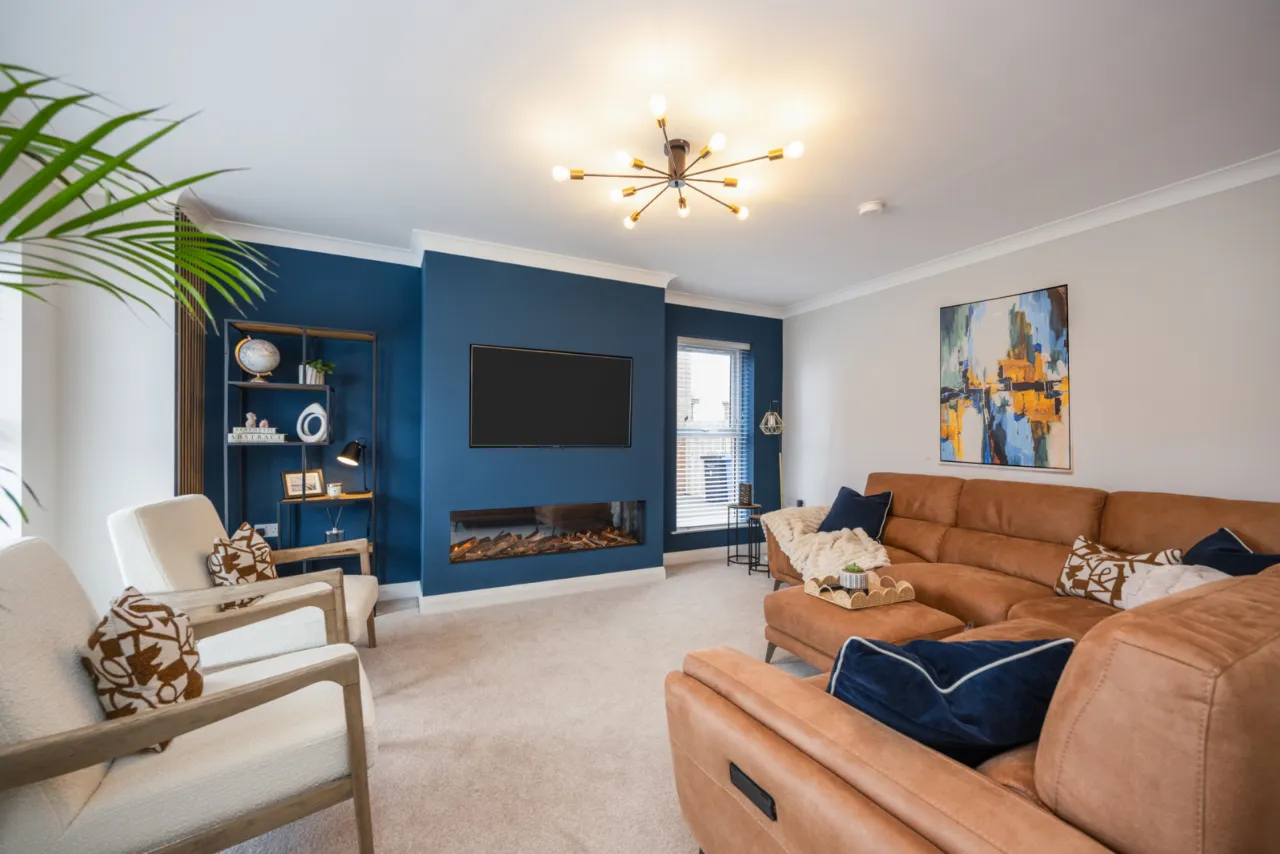 Newly fitted media wall with high end electric fire. Feature wood panelling.