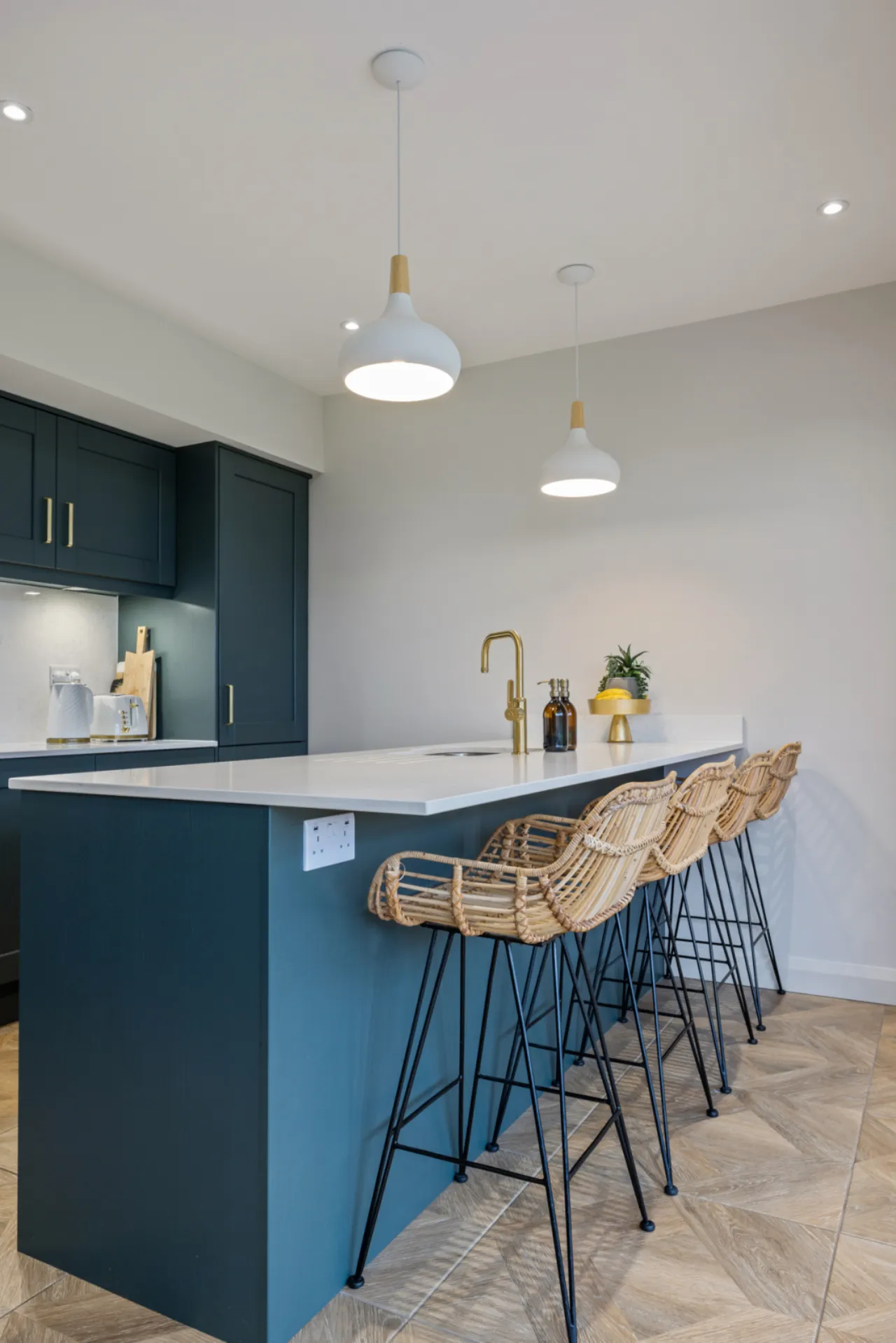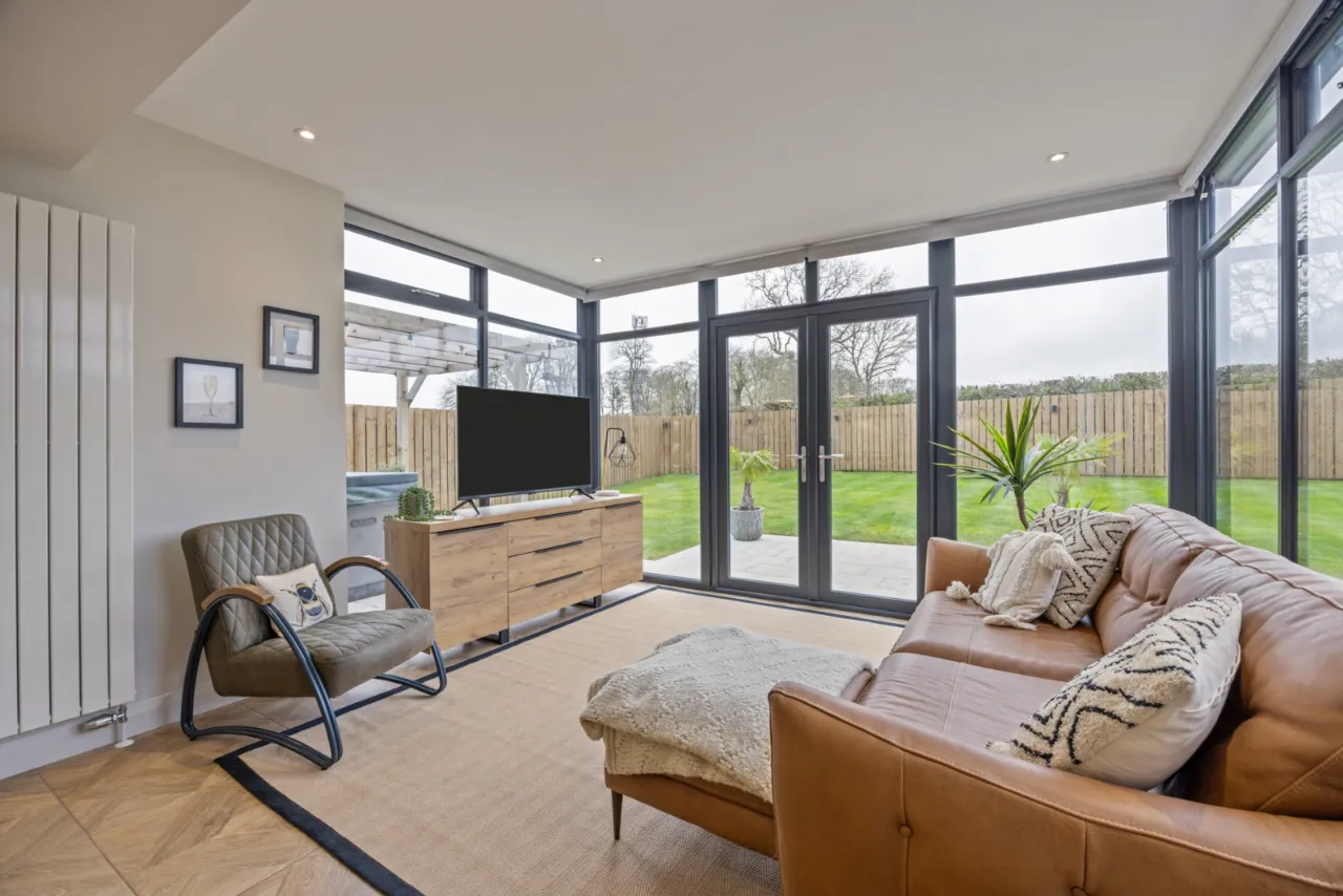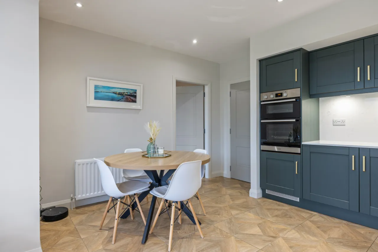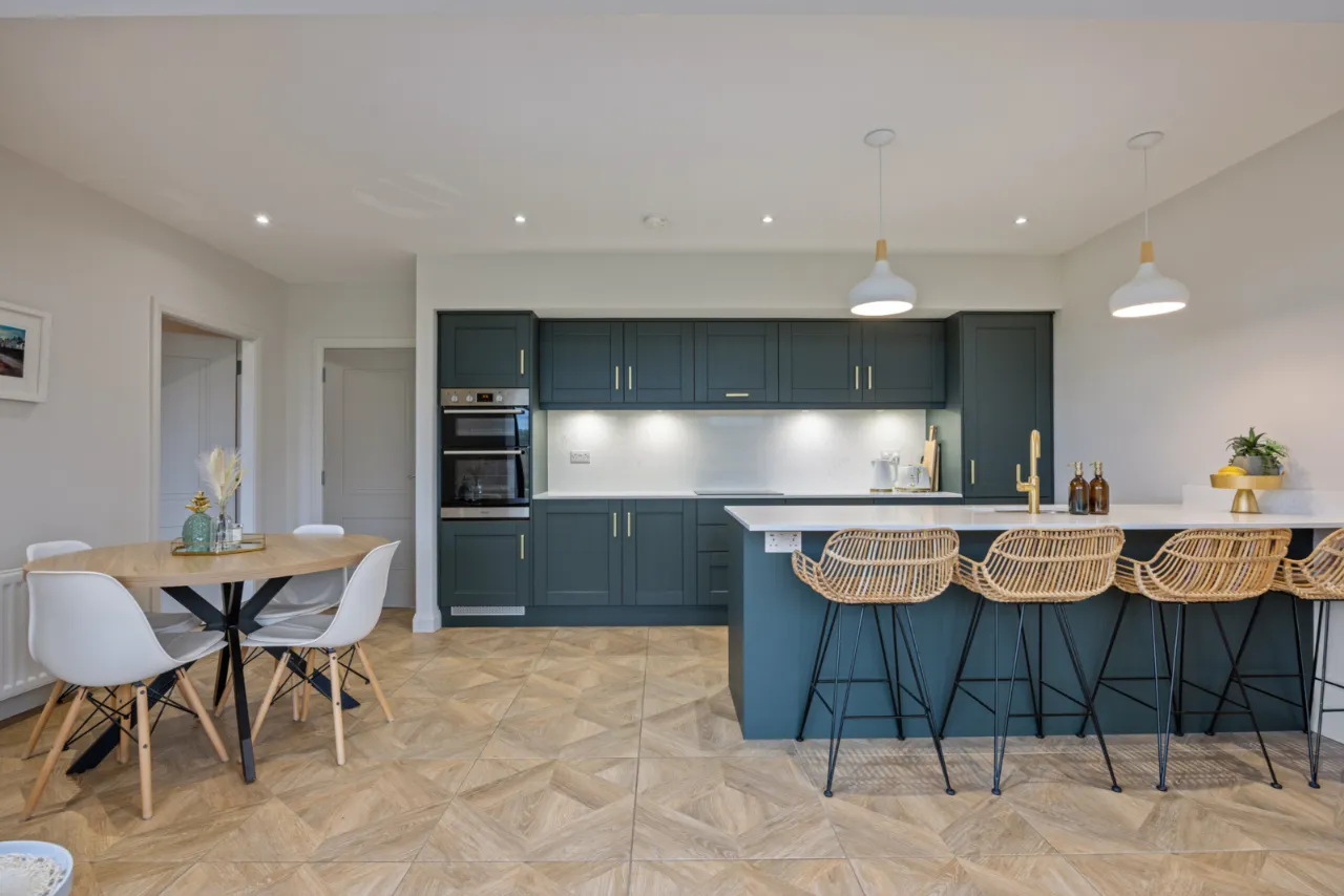 Excellent range of shaker style units with Quartz work surfaces, upstand and splashback, large island with built in breakfast bar, inset 1 1/4 bowl sink unit with feature mixer tap, integrated fridge and freezer, integrated dishwasher, integrated Induction hob with extractor above, high level double oven, integrated bins, ceramic tiled floor, uPVC double glazed French doors to patio and garden.