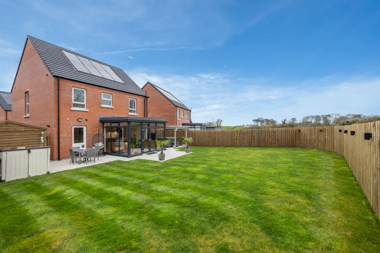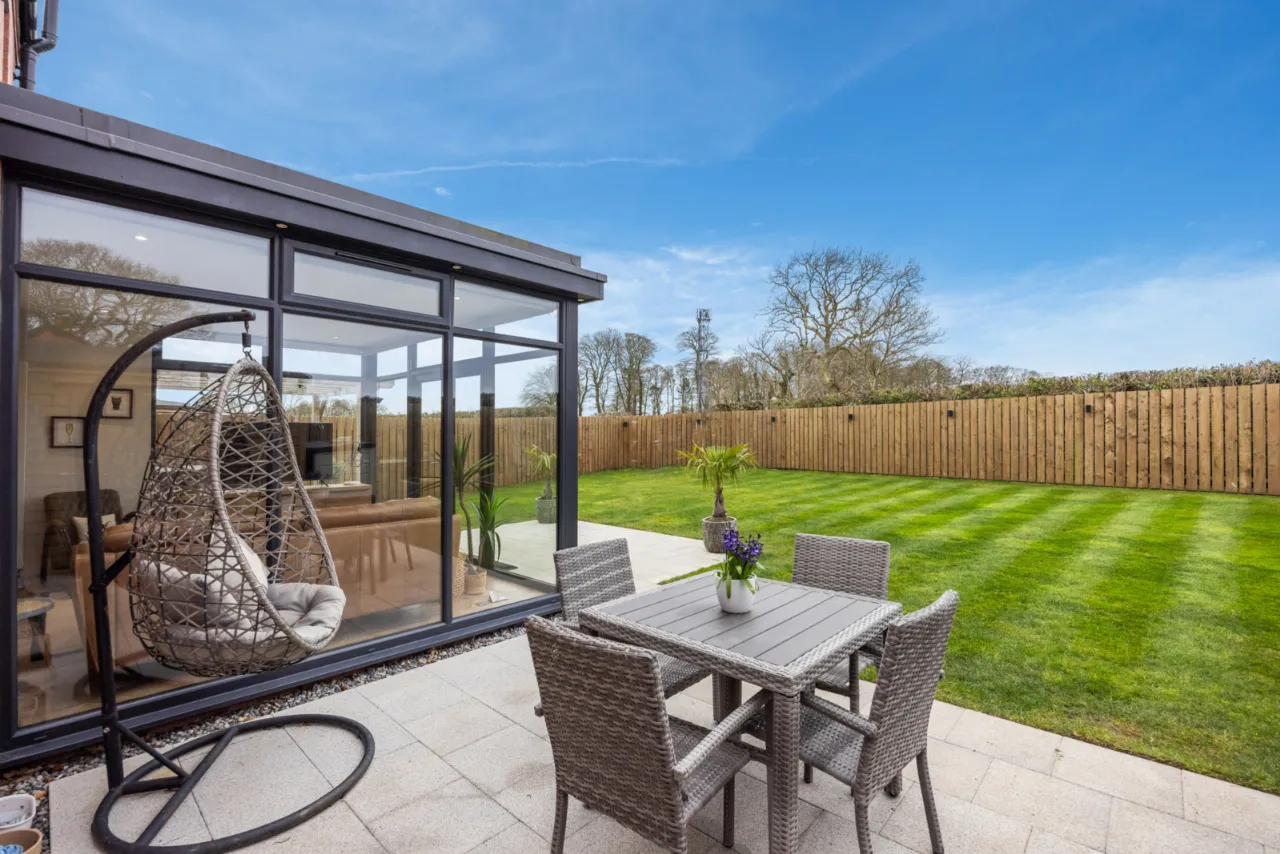 Large, private south-facing rear garden laid in lawns with extensive paved patio area, outside tap, outside lighting, outside power, hot and cold water tap, EV charging point. 8 solar panels.
