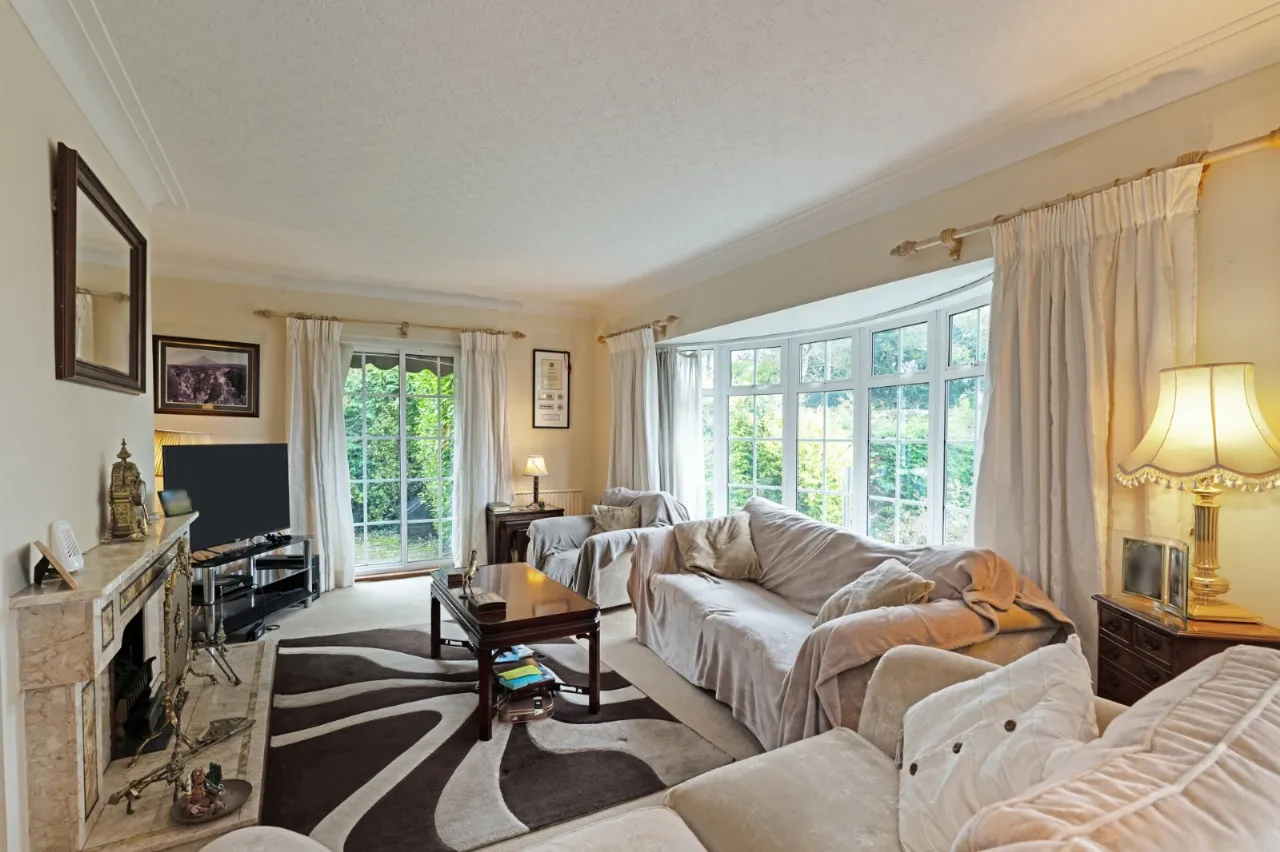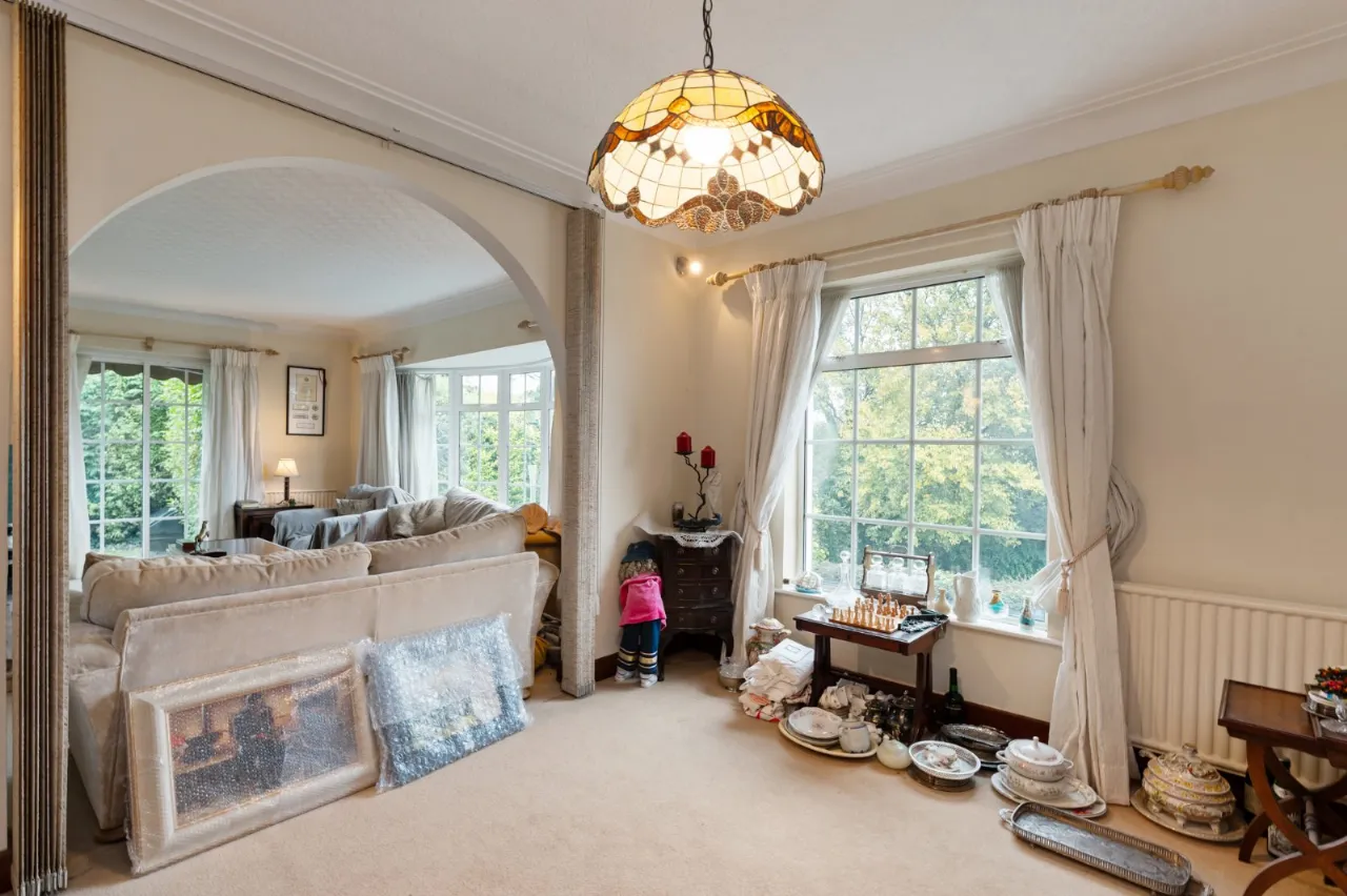 Good size lounge with bow window and garden views. Feature fireplace and cornicing. Arch to dining room