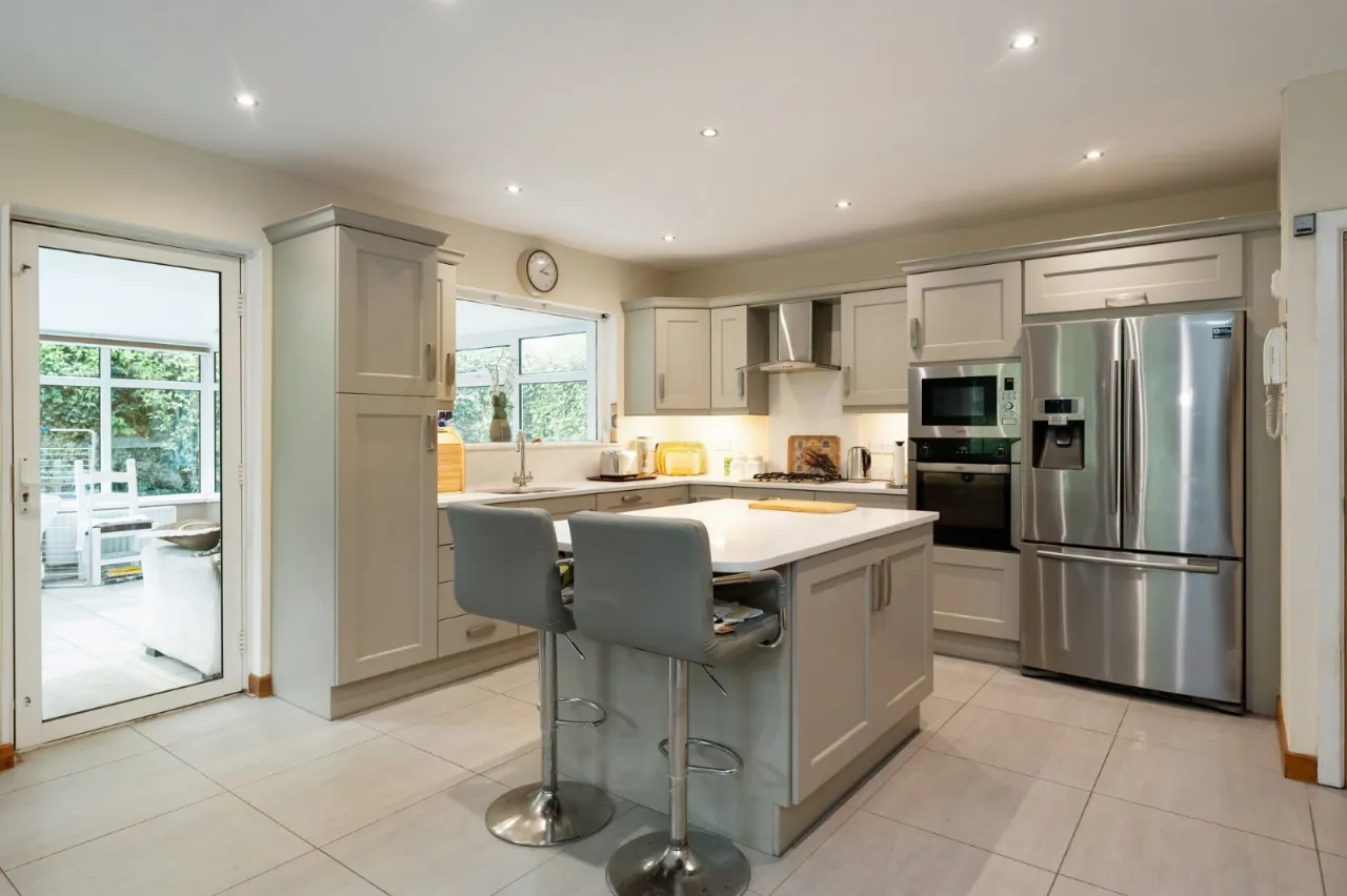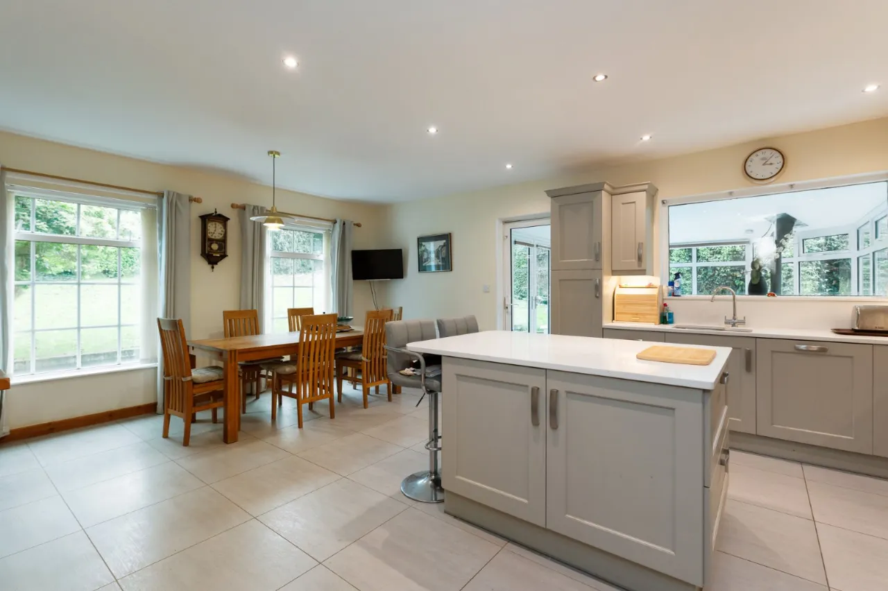 A modern kitchen with attractive units to comprise, granite worktop plus island, 1.5 Frankie sink, 4 ring gas hob, mid oven and recess for american style fridge/freezer, island with storage. Tiled floor and spacious dining area