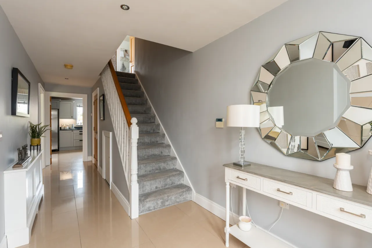 Tiled flooring, spotlighting and storage below stairs