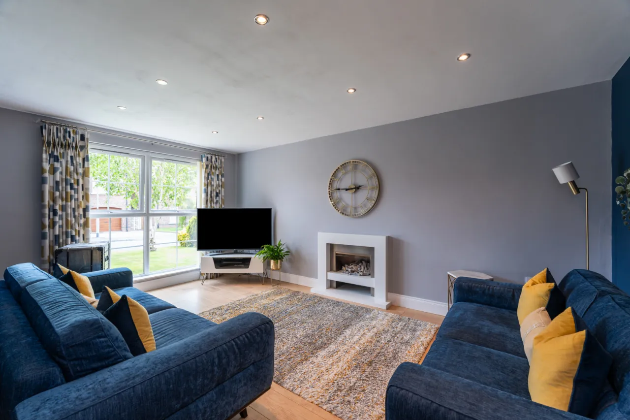Laminate wood effect flooring, spotlighting, outlook to front, feature gas fireplace