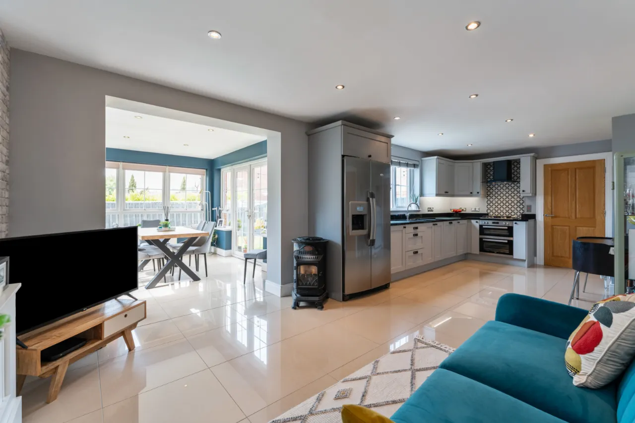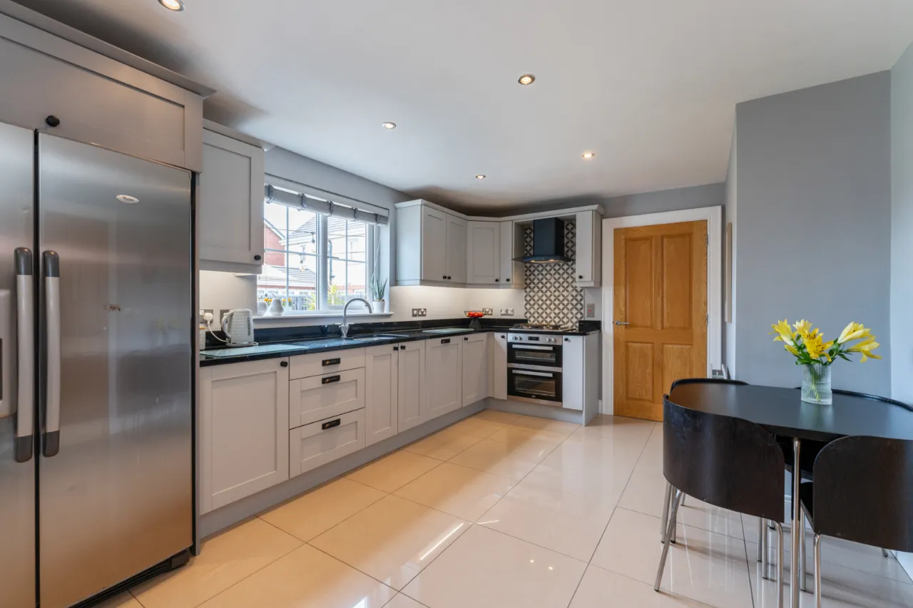 Fantastic range of high and low level units, granite worktops, inset sink with 1.5 tub and mixer tap, integrated double oven with 4 ring gas hob, extractor fan, tiled splashback, plumbed for American style double fridge freezer, integrated dishwasher, tiled flooring throughout, spotlighting, open to dining area