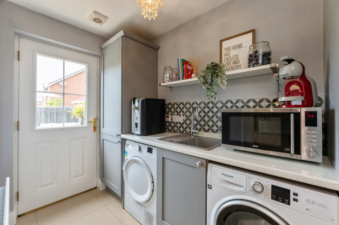 Range of high and low level units, laminate work surface with sink unit and drainer, 1 tub with mixer tap, plumbed for washing machine, space for tumble dryer, tiled flooring, extractor fan, gas boiler, access to rear garden, access to integral garage