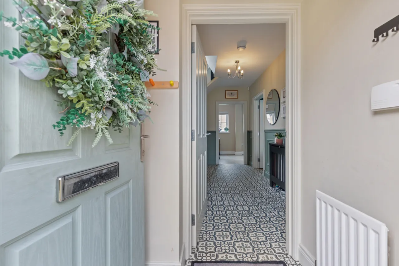 Composite front door with glass inset, leading into reception porch.