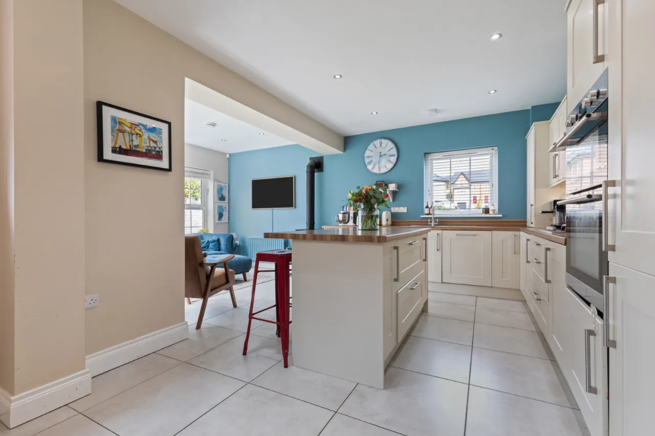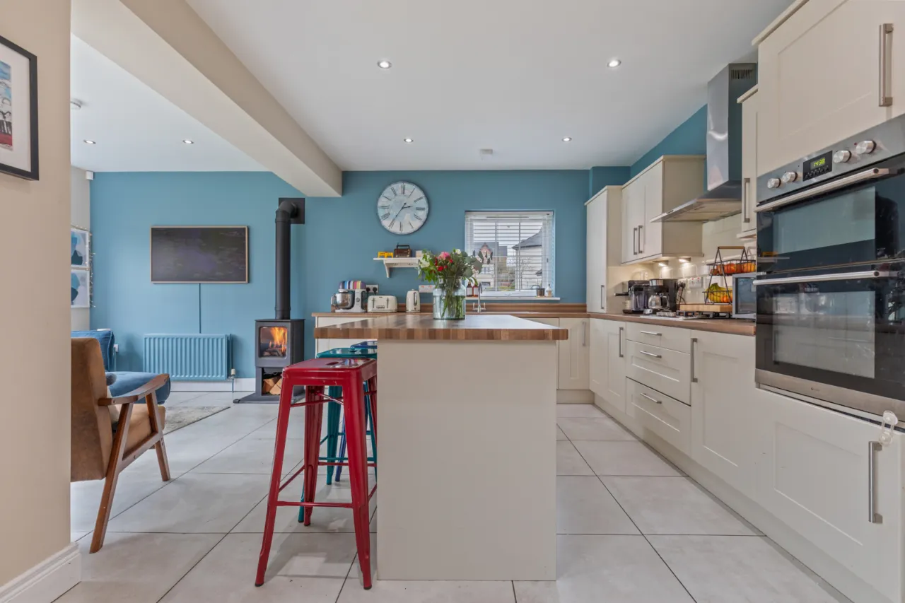 Range of high and low level units with laminate work surface and stainless steel sink unit and drainer, 1.5 tub with mixer tap, integrated fridge freezer, integrated double oven, four ring gas hob with stainless steel extractor fan above, integrated dishwasher, integrated washing machine, island unit for casual dining, partly tiled walls, tiled flooring, recessed spotlighting, open to dining and sun room, cast iron gas stove, double uPVC door leading to rear garden.