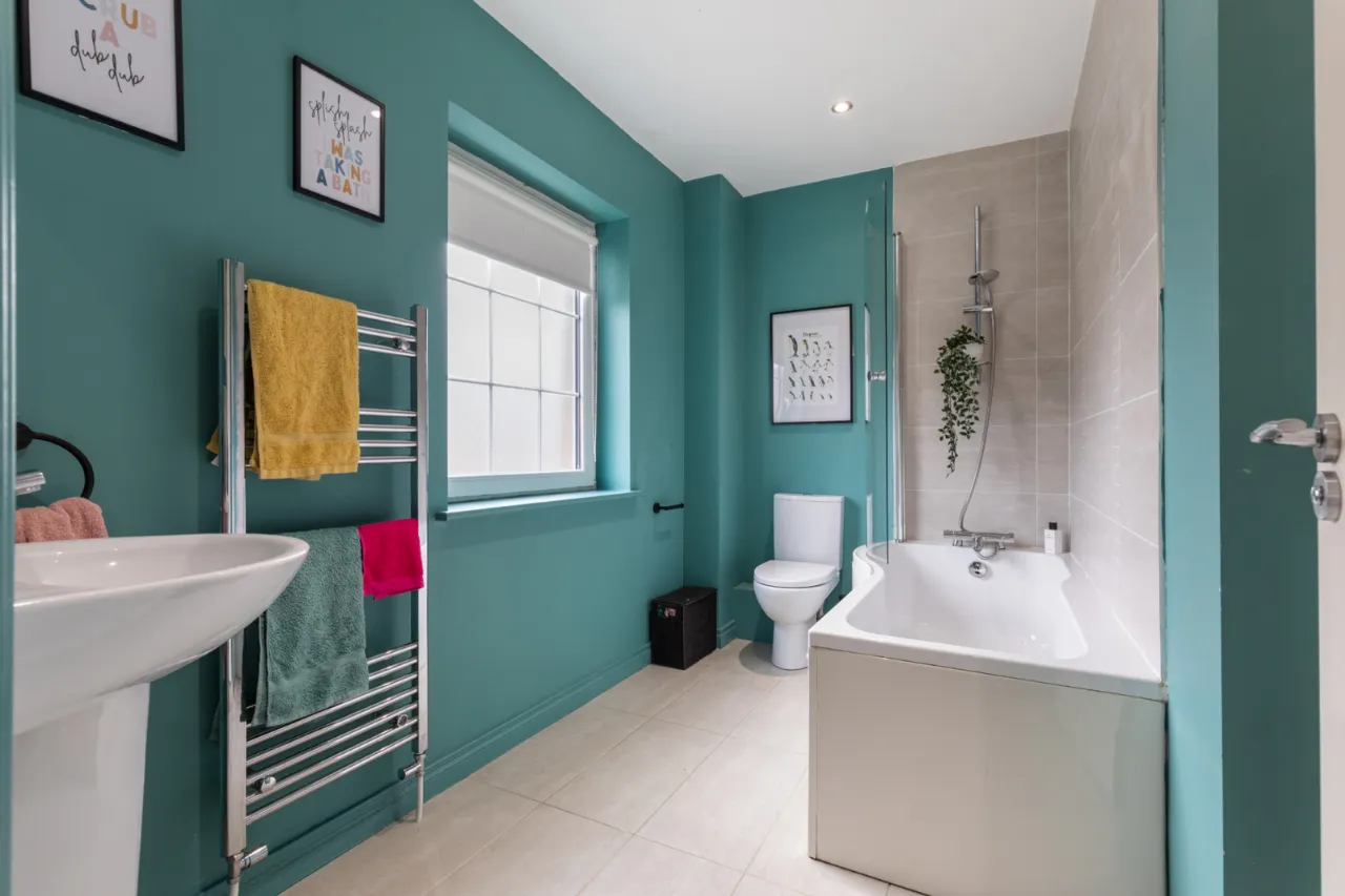 White suite comprising of low flush WC, wash hand basin with mixer tap, tiled splash back. Panelled bath with mixer tap and handset, partly tiled walls, tiled flooring, recessed spotlighting, extractor fan, vertical chrome heated towel rail, storage cupboard.
