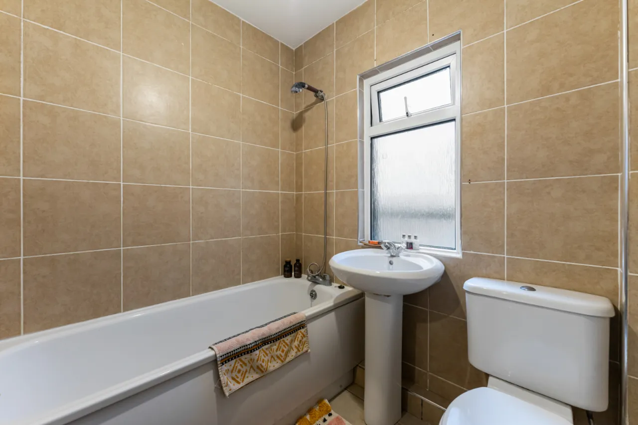 White suite comprising: Panelled bath with mixer taps, pedestal wash hand basin, low flush WC, fully tiled walls, ceramic tiled floor, chrome towel radiator.