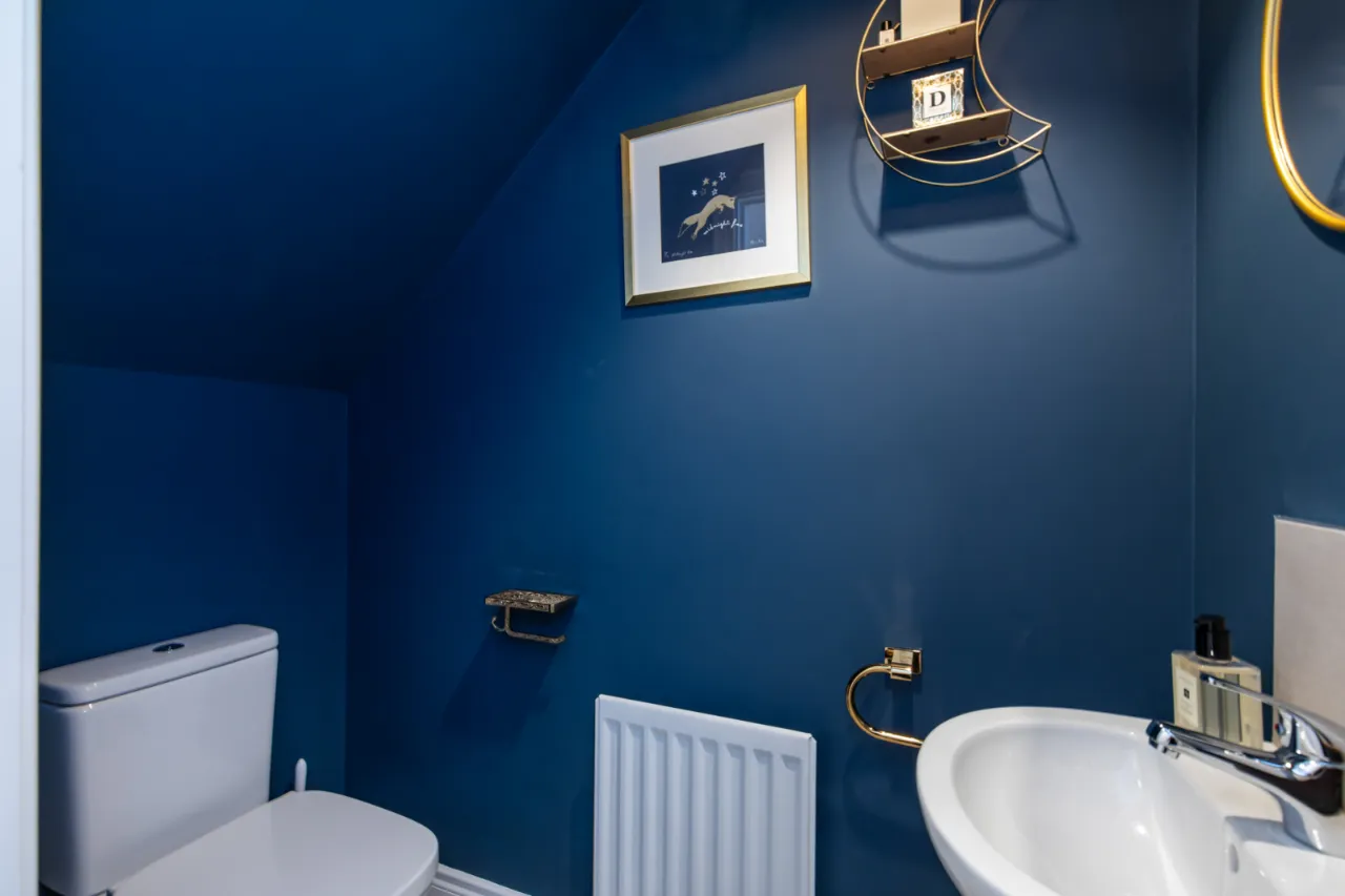 White suite comprising of low flush WC, full pedestal wash hand basin with mixer tap, tiled splash back, tiled flooring, extractor fan.