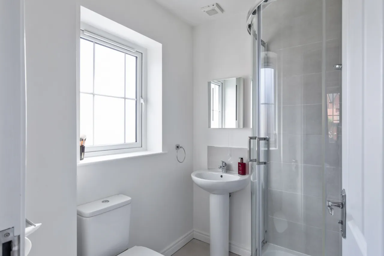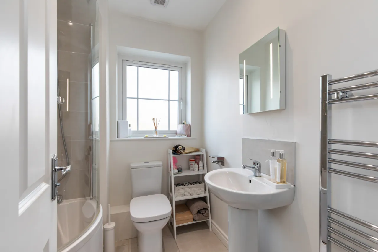 White suite comprising of low flush WC, pedestal wash hand basin with mixer tap, tiled splash back, walk-in thermostatically controlled shower with rainfall shower head and handset, partly tiled walls, tiled flooring, recessed spotlighting, extractor fan, vertical chrome heated towel rail.