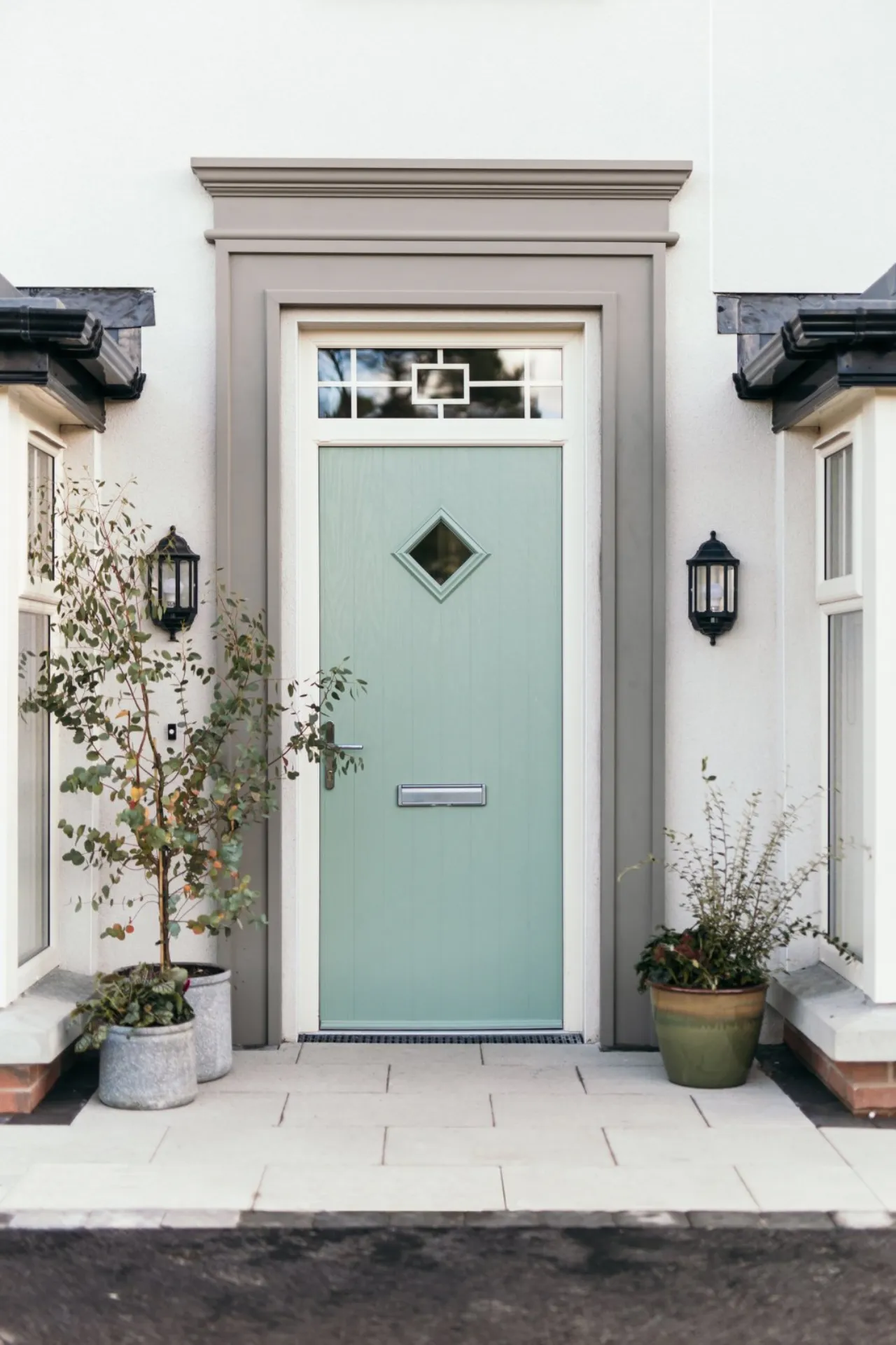 Contemporary style light at front door with a traditional bulkhead light to the rear door