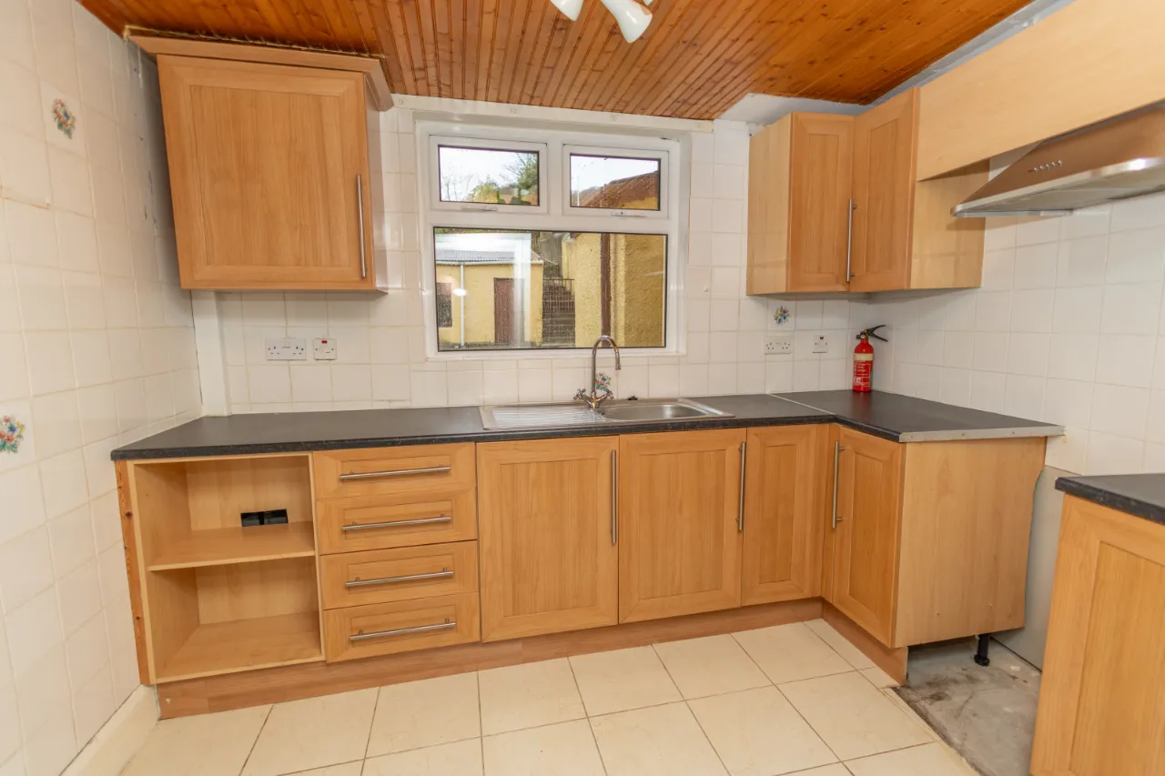 Rear facing, tiled flooring and tiled walls, upper and lower level wood laminate kitchen cupboards, single drainer sink with mixer tap, laminate worktops, space for free standing appliances, extractor fan. Single radiator.