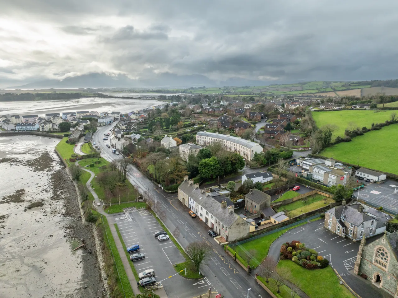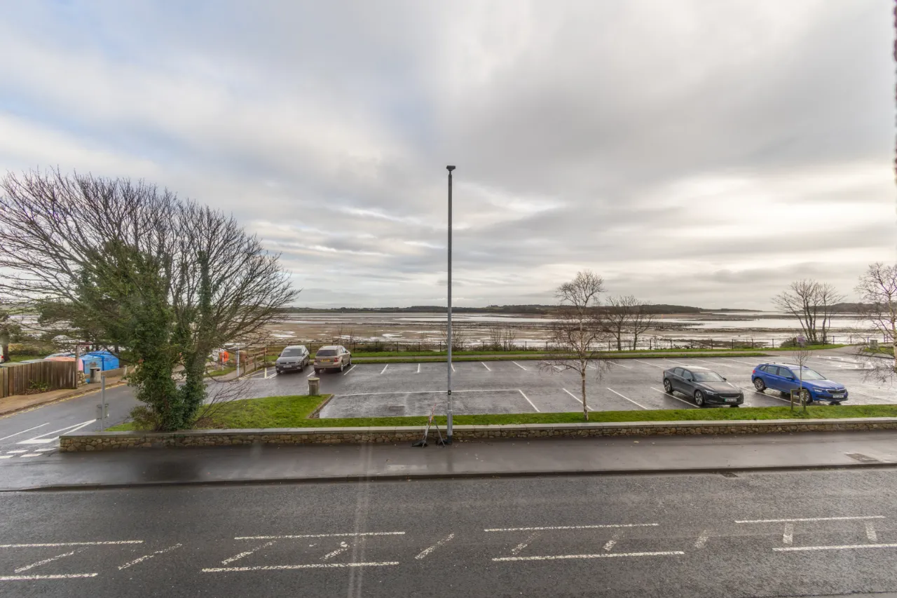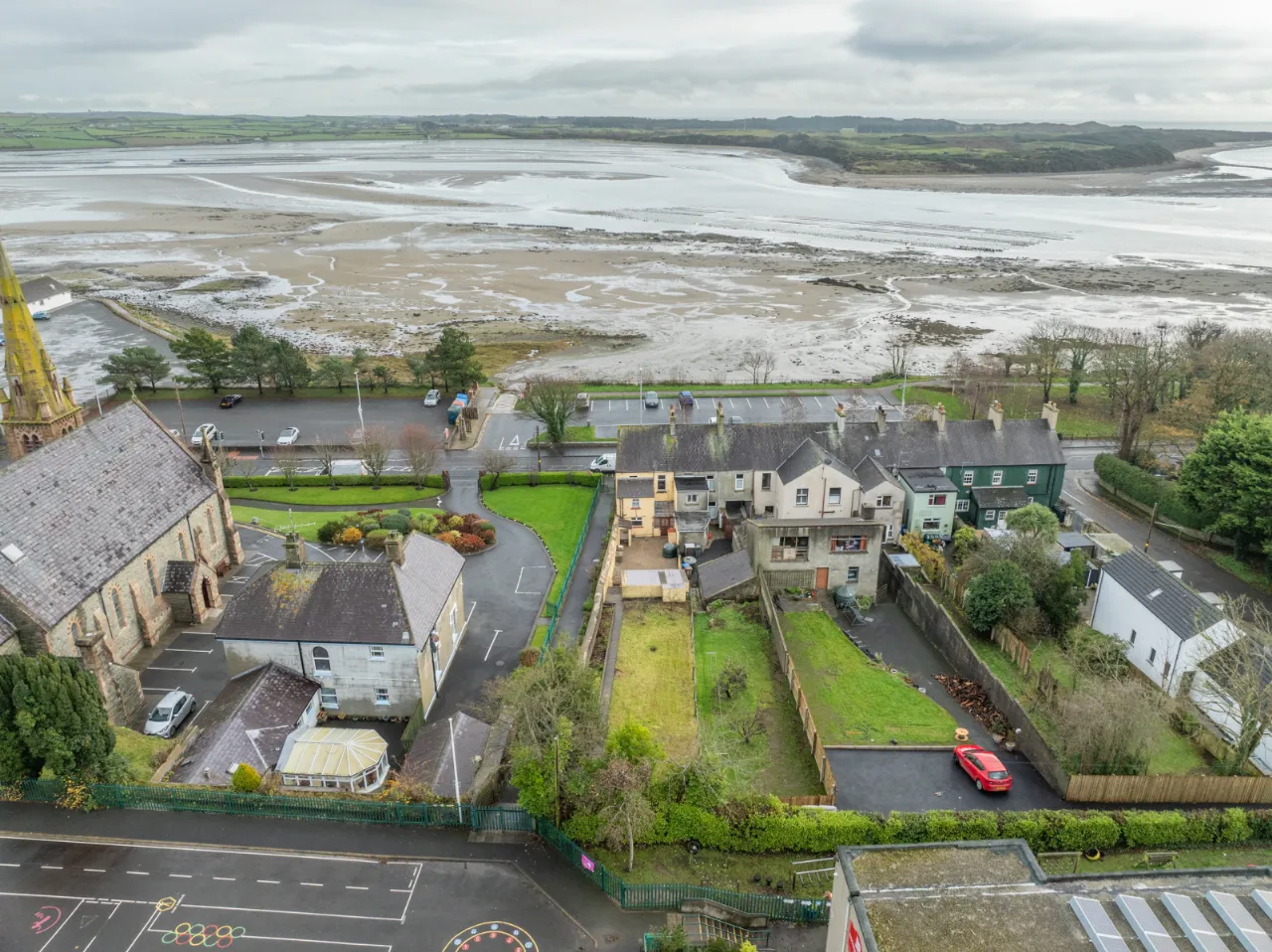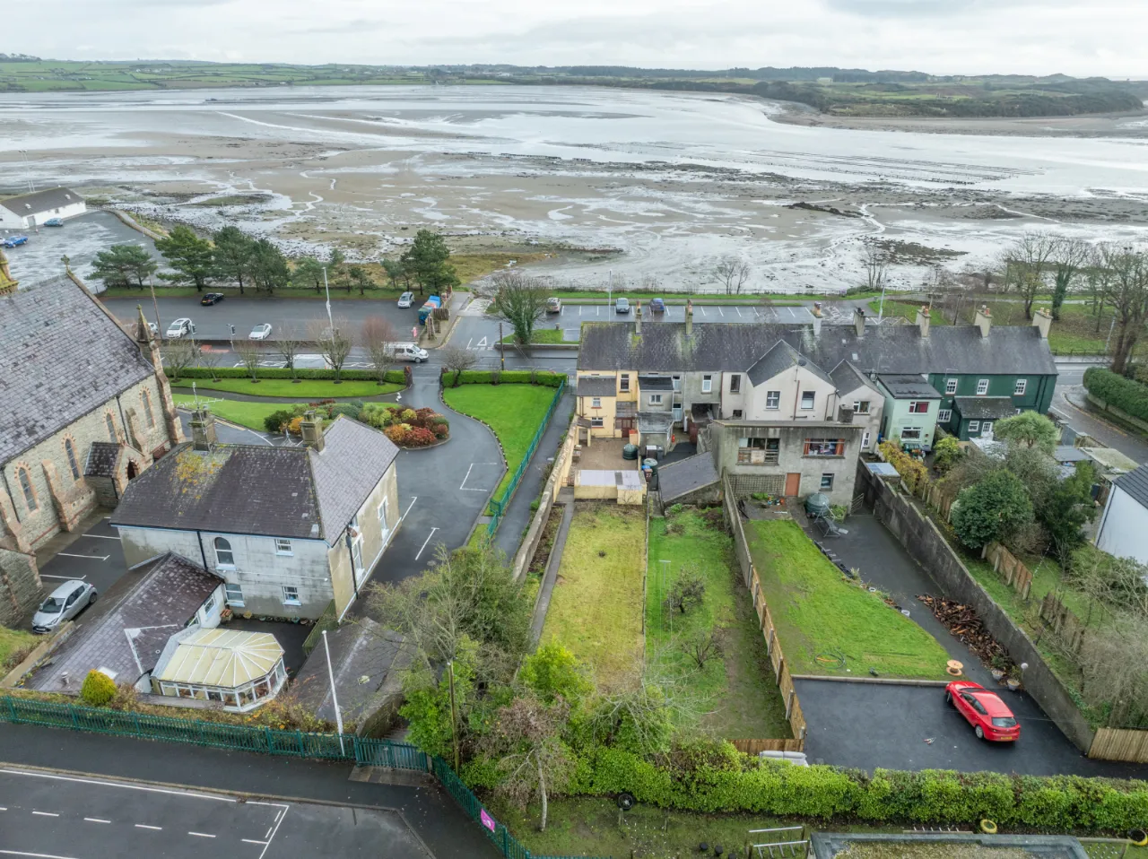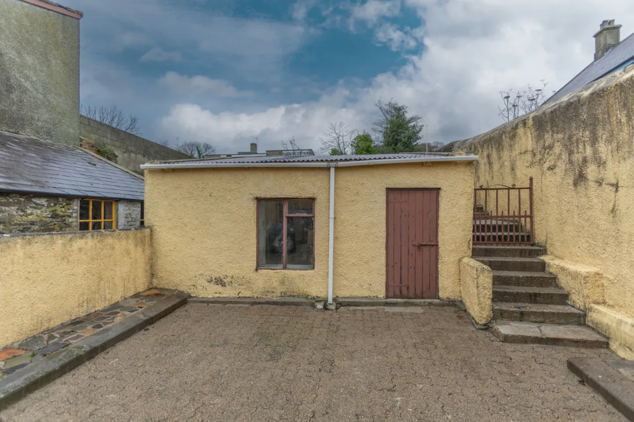 Covered backyard leading to a rear yard with boiler, coal/wood store, and additional outhouse storage, plus a gate providing access for bins. A large rear garden, accessed via steps, is laid in lawn and features mature apple trees and fabulous views over Dundrum Bay.