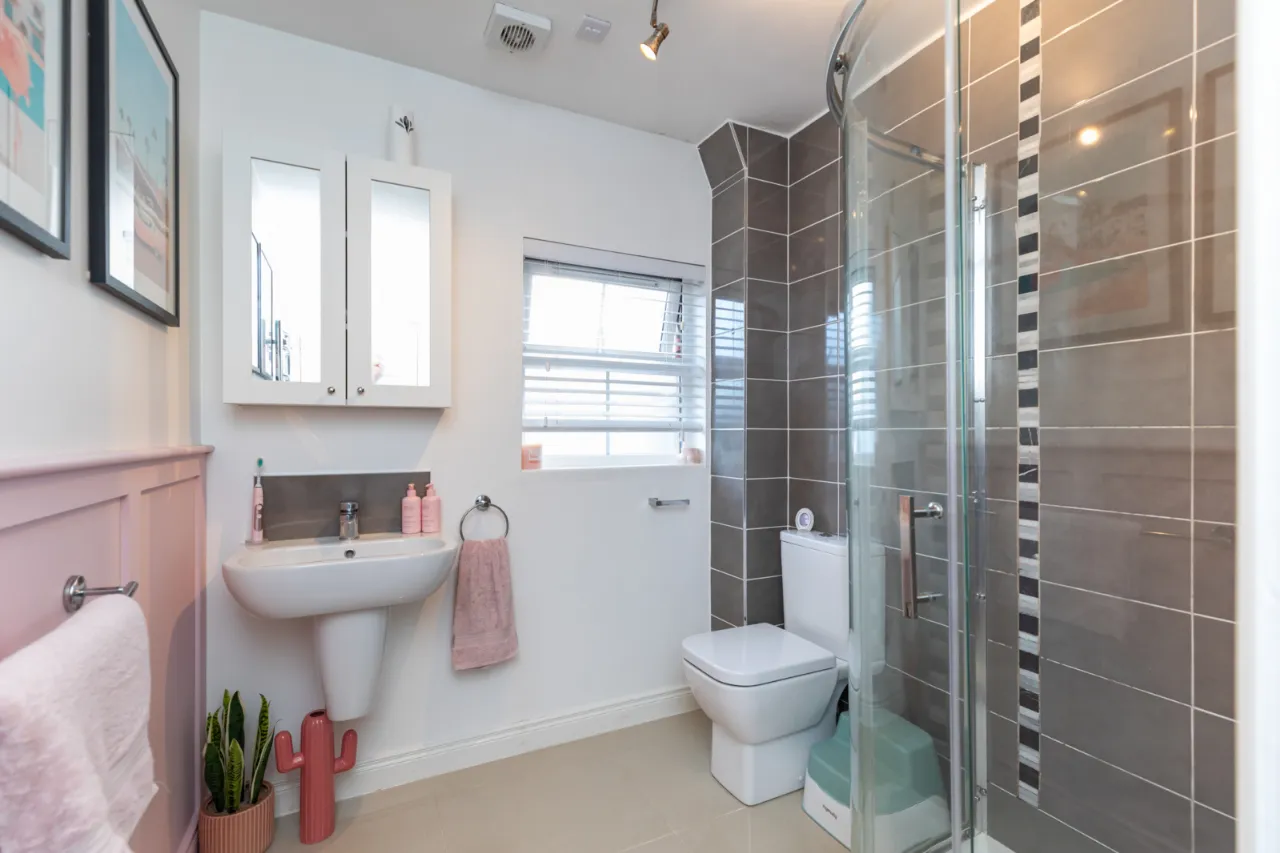 Ceramic tiled floor, low flush WC, pedestal wash hand basin, fully tiled corner shower cubicle, extactor fan, chrome heated towel rail