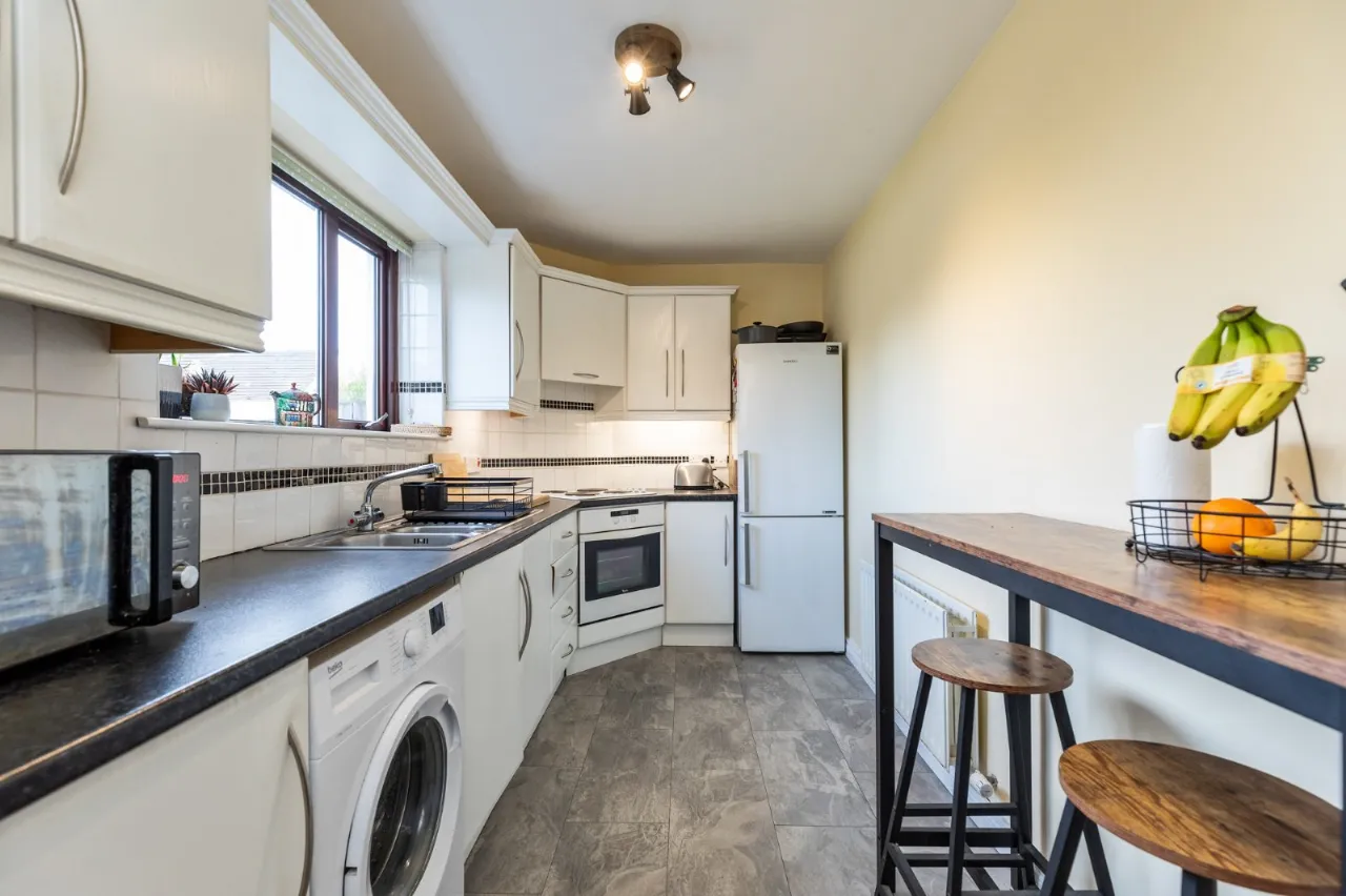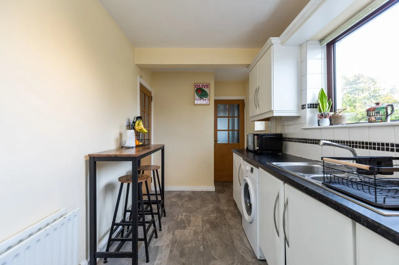 Modern fitted kitchen with excellent range of units, sink unit, integrated oven and four ring electric hob, extractor hood, plumbed for washing machine, concealed lighting.