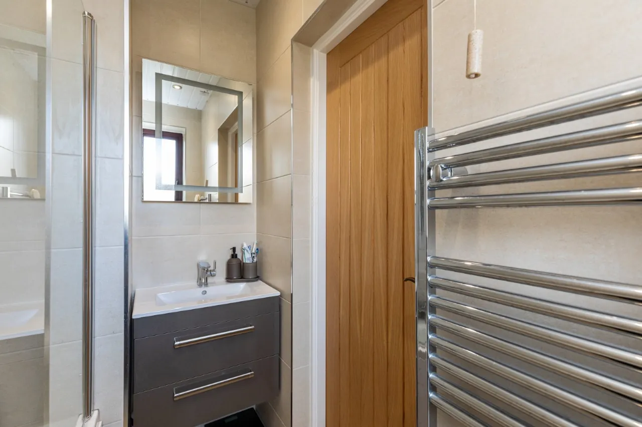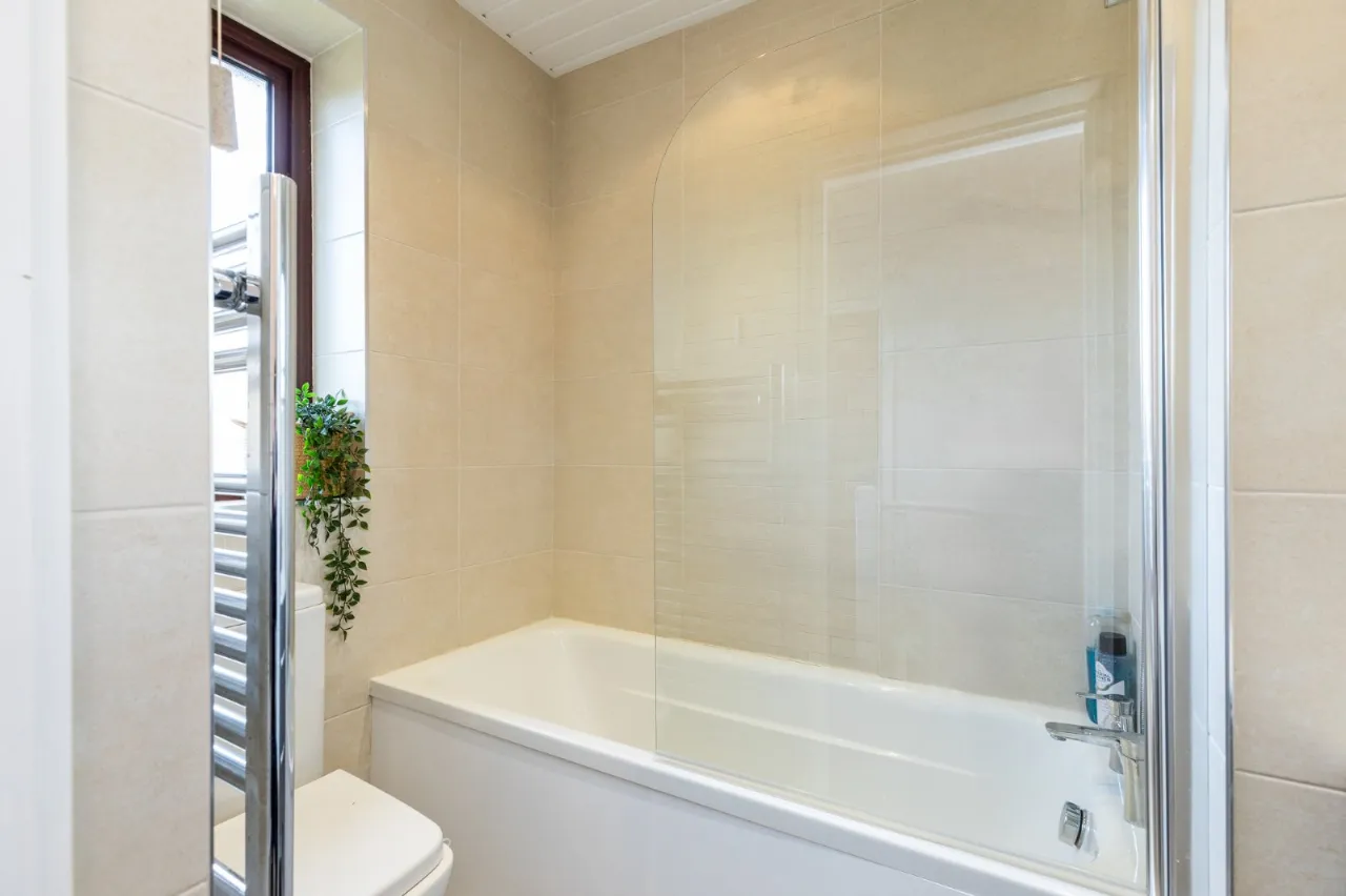 Modern fully tiled bathroom and additional shower room with uPVC panelling