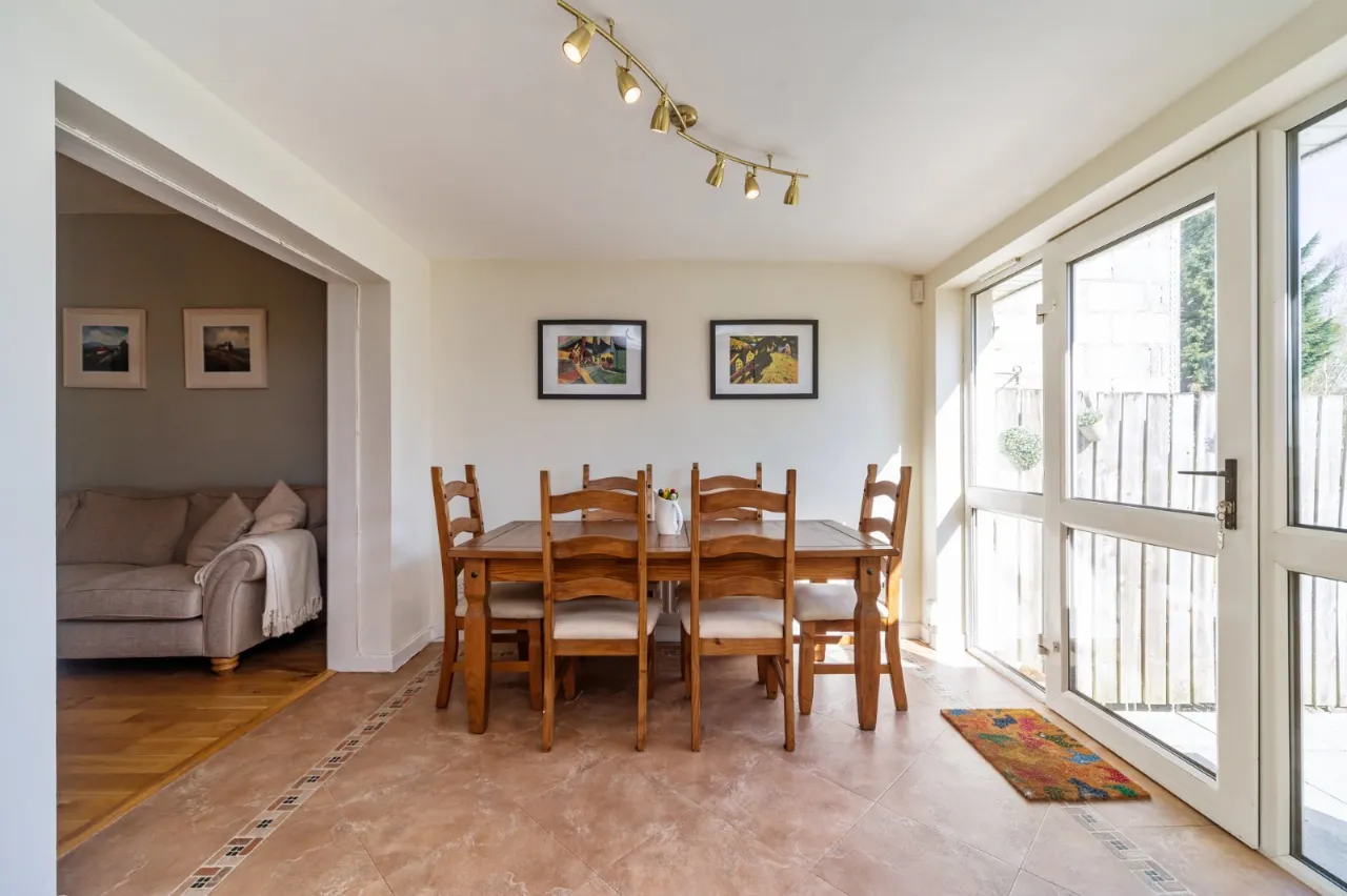 Tiled floor, range of high and low level units, partly tiled walls, 1.5 bowl ceramic sink unit, space for oven, glass and stainless steel extractor fan, plumbed for washing machine, integrated fridge freezer, integrated dishwasher, uPVC double glazed door leading outside, open plan to