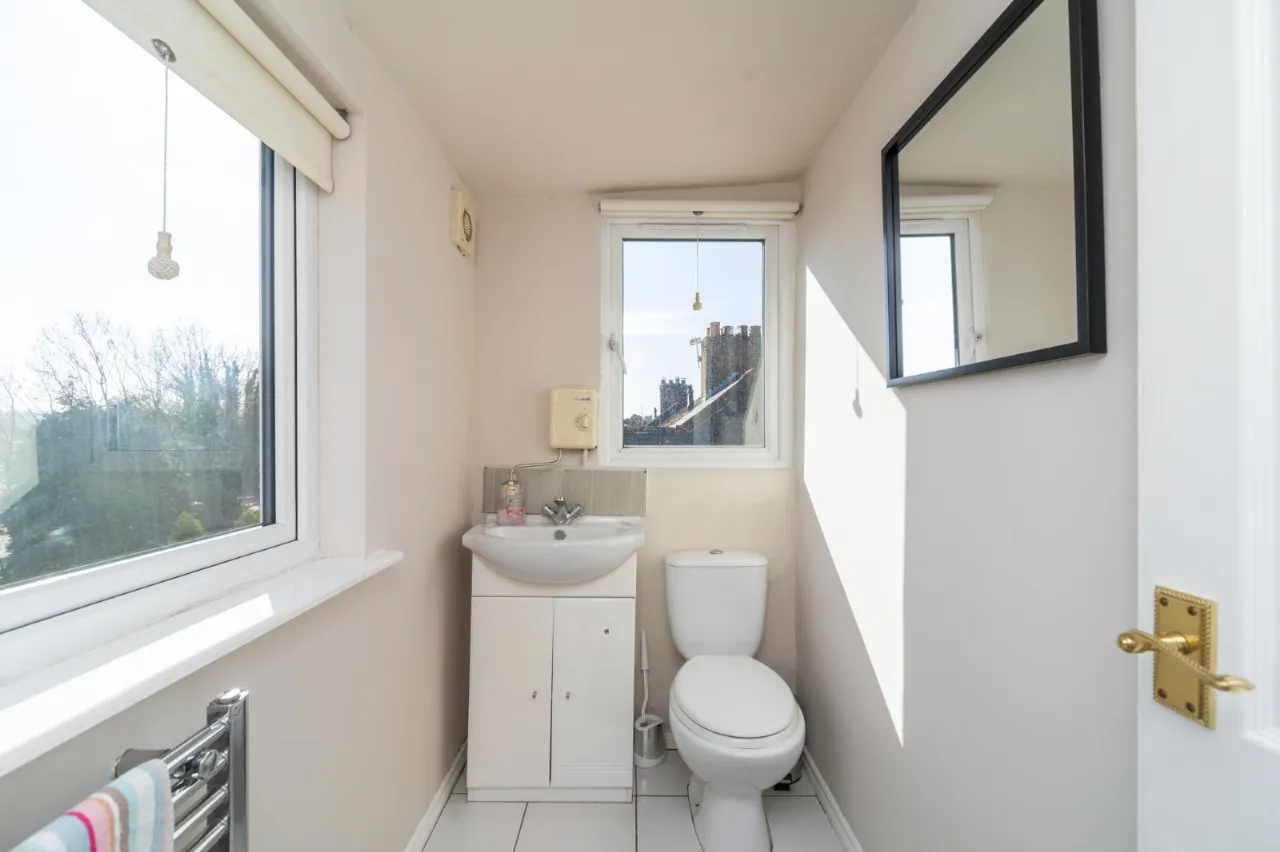 Tiled floor, low flush WC, pedestal wash hand basin withh vanity unit, chrome heated towel radiator, extractor fan