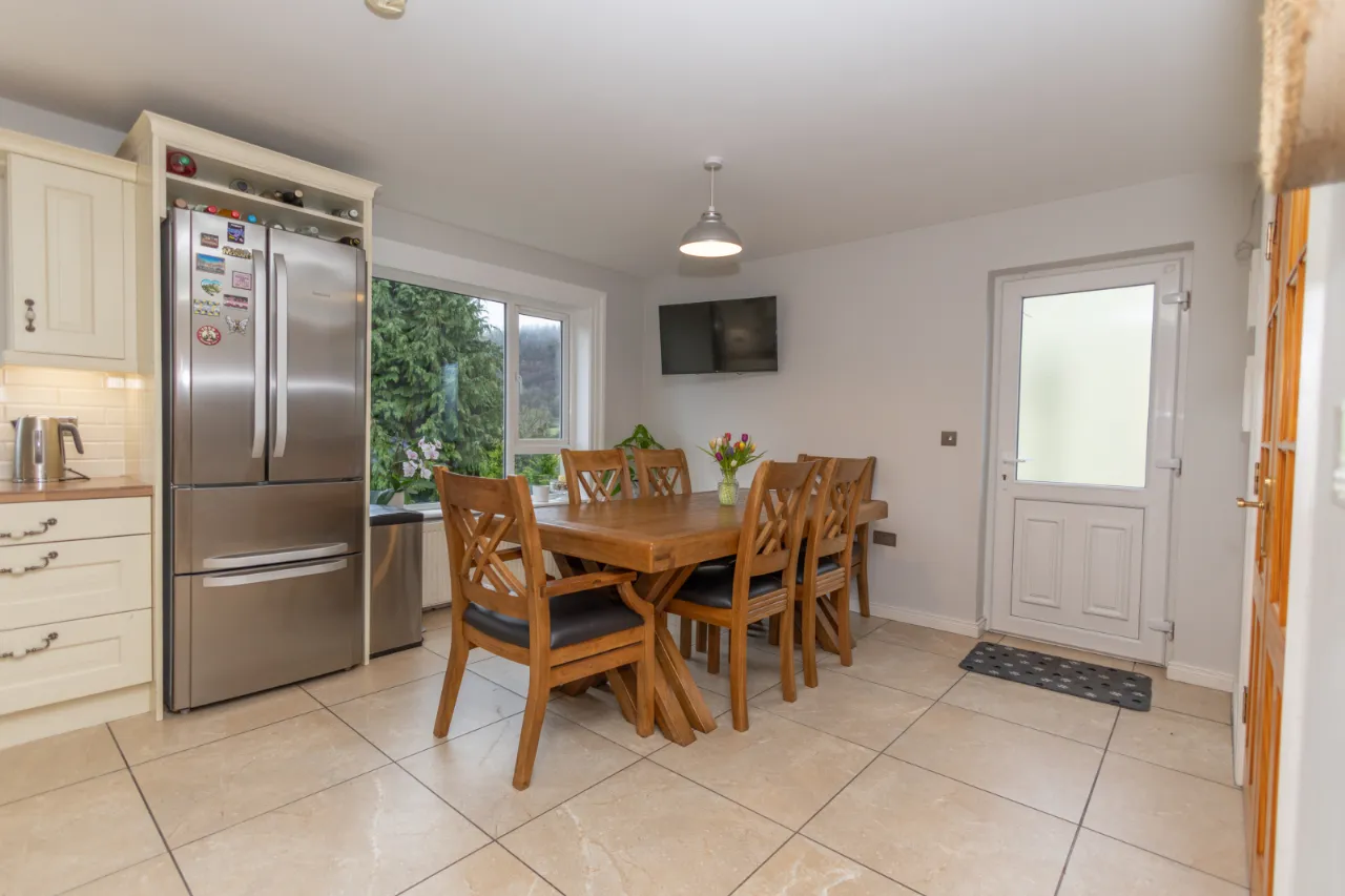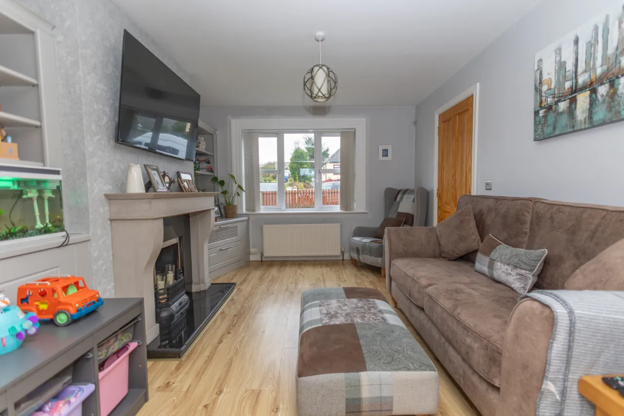 Laminate floor, PVC Double Glazing, built in shelving/ storage units, open fire, tiled hearth with stone effect surround and cast iron inset, double doors leading to kitchen/ dinning room.