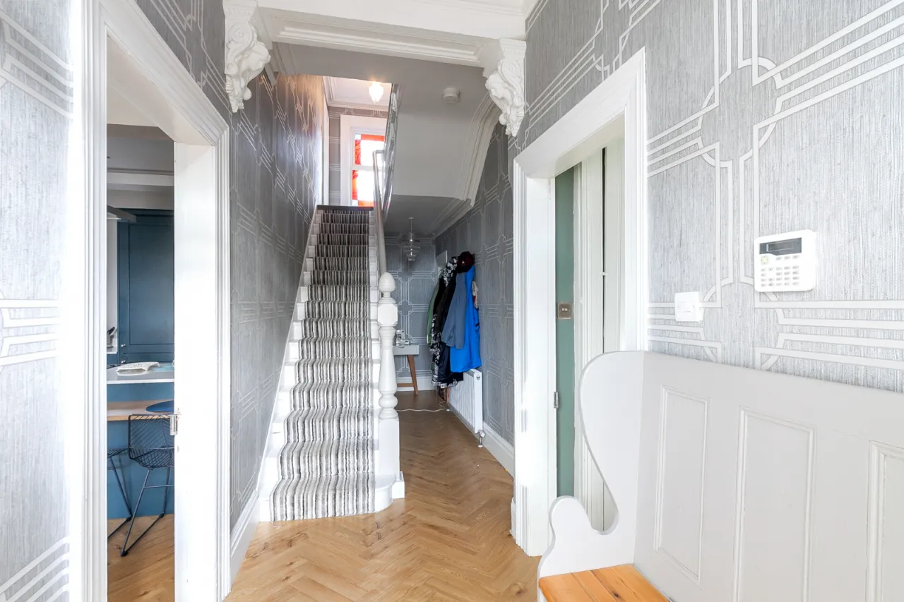 Herringbone wooden floor, original corniced ceiling, original corbels, ceiling rose and under stairs storage.