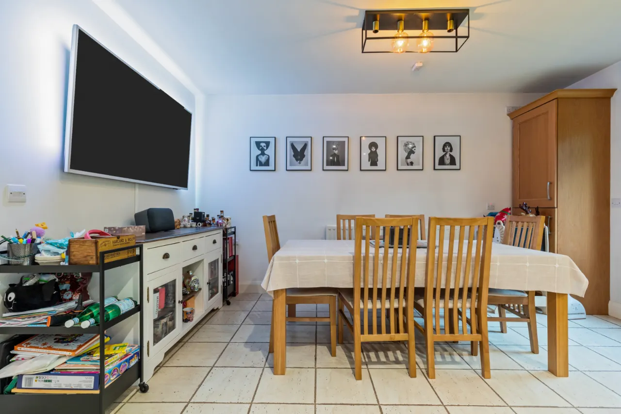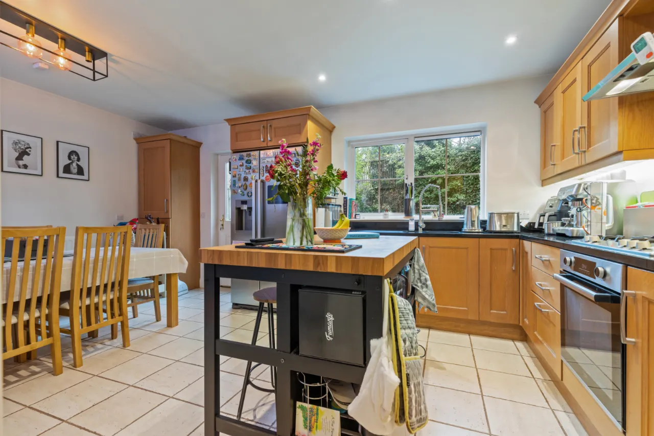 Comprises of excellent range of high and low level oak units and granite worktops. Single bowl sink unit with mixer tap, drainer, five ring gas hob with overhead stainless steel extractor unit and under bench oven. Space for American fridge and freezer, integrated dishwasher, open plan into formal dining space, access to utility room and access to rear garden.