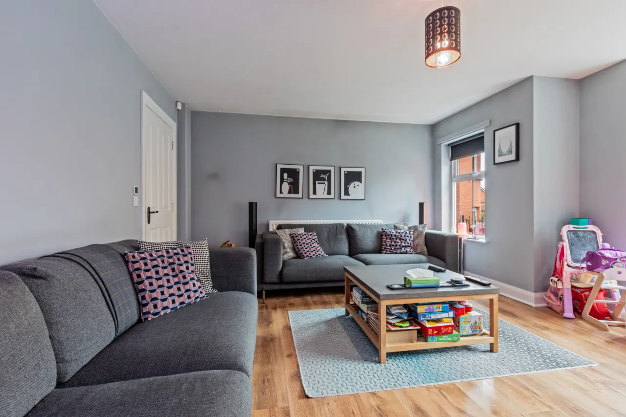Paved patio area, garden laid in grass, outside tap and light. Driveway parking for two vehicles.