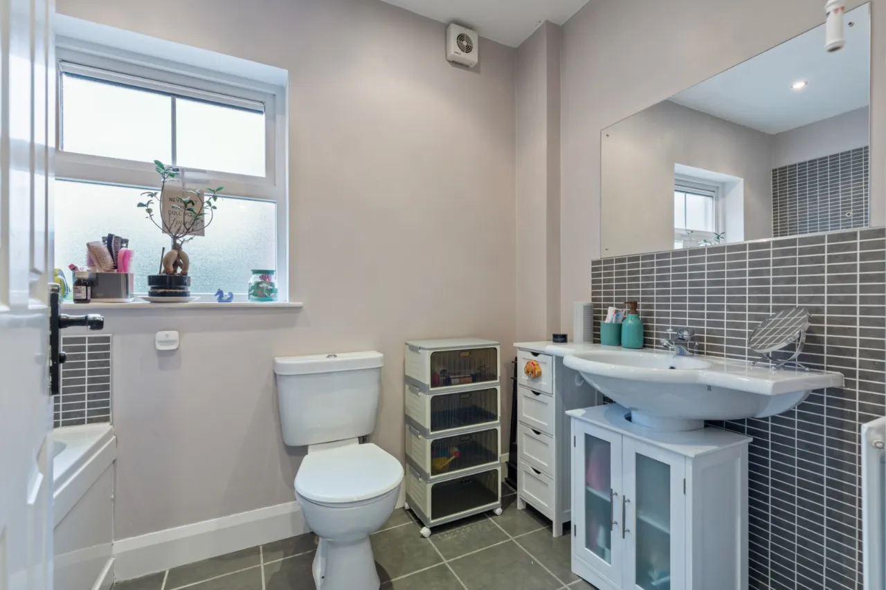 Comprises of paneled bath with overhead shower and shower screen. Ceramic bowl sink unit with mixer tap and tiled splash back. Low flush WC, tiled floor, recessed lighting and extractor fan.
