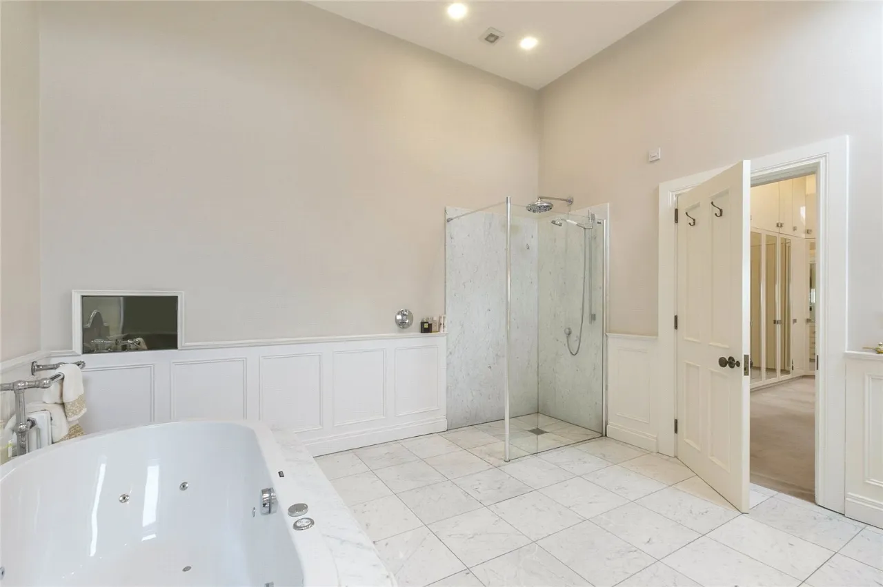 Marble tiled floor, wet room shower cubicle with thermostatic shower unit, drencher multi jet shower head, feature stand-alone Duscholux Jacuzzi bath with mixer taps and telephone hand shower, integrated TV, twin heated towel rails, integrated double sink vanity unit with granite worktop and upstands, Axor mixer taps, integrated wood panelling with mirror and wired for side lamps, recessed lighting, velux windows, integrated music system, extractor fan.
