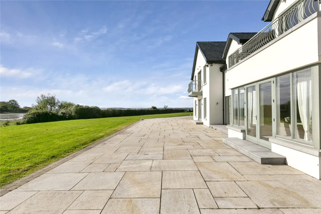 At widest points. Design House solid wood kitchen with granite worktops, 4 oven electric Aga with additional gas hob and two ovens, built in tap over Aga, double Franke stainless steel sink with mixer tap, views over Strangford Lough, additional Wolf integrated gas hob, grill and deep vessel steamer with integrated extractor hood, Franke prep sink with boiling tap, mixer tap, excellent range of high and low level solid wood units, integrated Gaggenau dishwasher, integrated Gaggenau coffee machine, microwave and dual plate warmers, under unit lighting and second integrated Gaggenau dishwasher, double American Sub Zero fridges integrated into dressing unit with built in cupboards and storage baskets, additional limed oak dresser unit with built in shelving and display cupboards, extensive island unit with built in storage, breakfast bar with seating for 4 people and additional butcher block for food prep and additional storage, ceramic tiled floor, recessed lighting, open to: LIVING AREA: Open fire ornate carved stone surround, slate tiled inset and hearth, glazed French patio doors open to rear patio and garden with views over Strangford Lough and surrounding area. DINING AREA: Additional built in furniture, book cases and storage, half wall panelling, recessed lighting, solid oak strip wood floor, doorway through to: