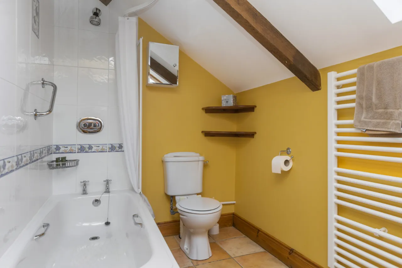White suite comprising panelled bath with thermostatic shower. Low flush WC. Pedestal wash hand basin. White towel radiator. Partially tiled walls. Ceramic tiled floor.