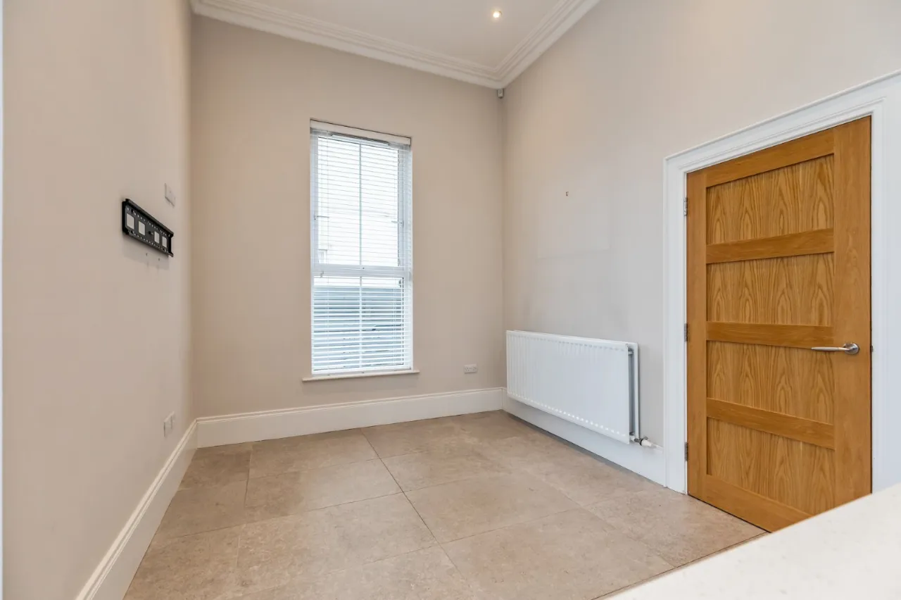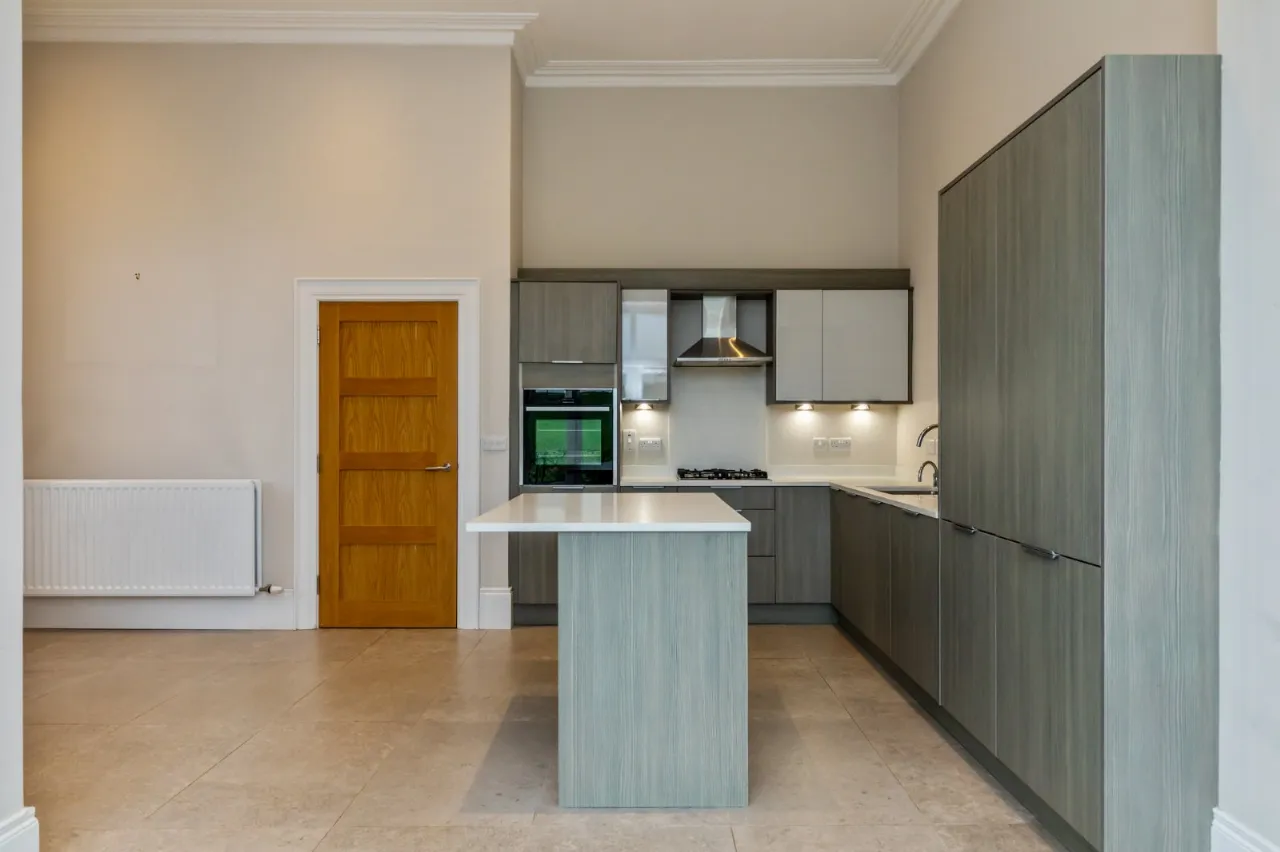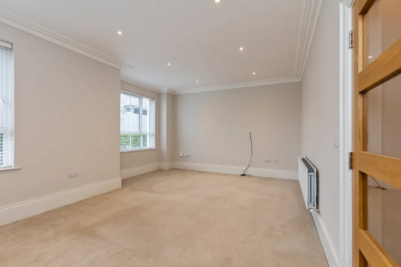 Corniced ceiling, low voltage spotlights.