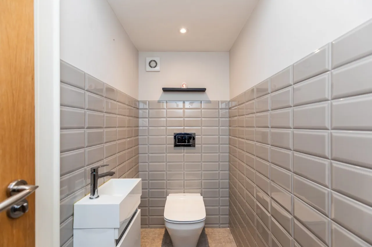 Concealed cistern WC, wash hand basin with chrome mixer taps in vanity unit, partly tiled walls, ceramic tiled floor, extractor fan, low voltage spotlights.