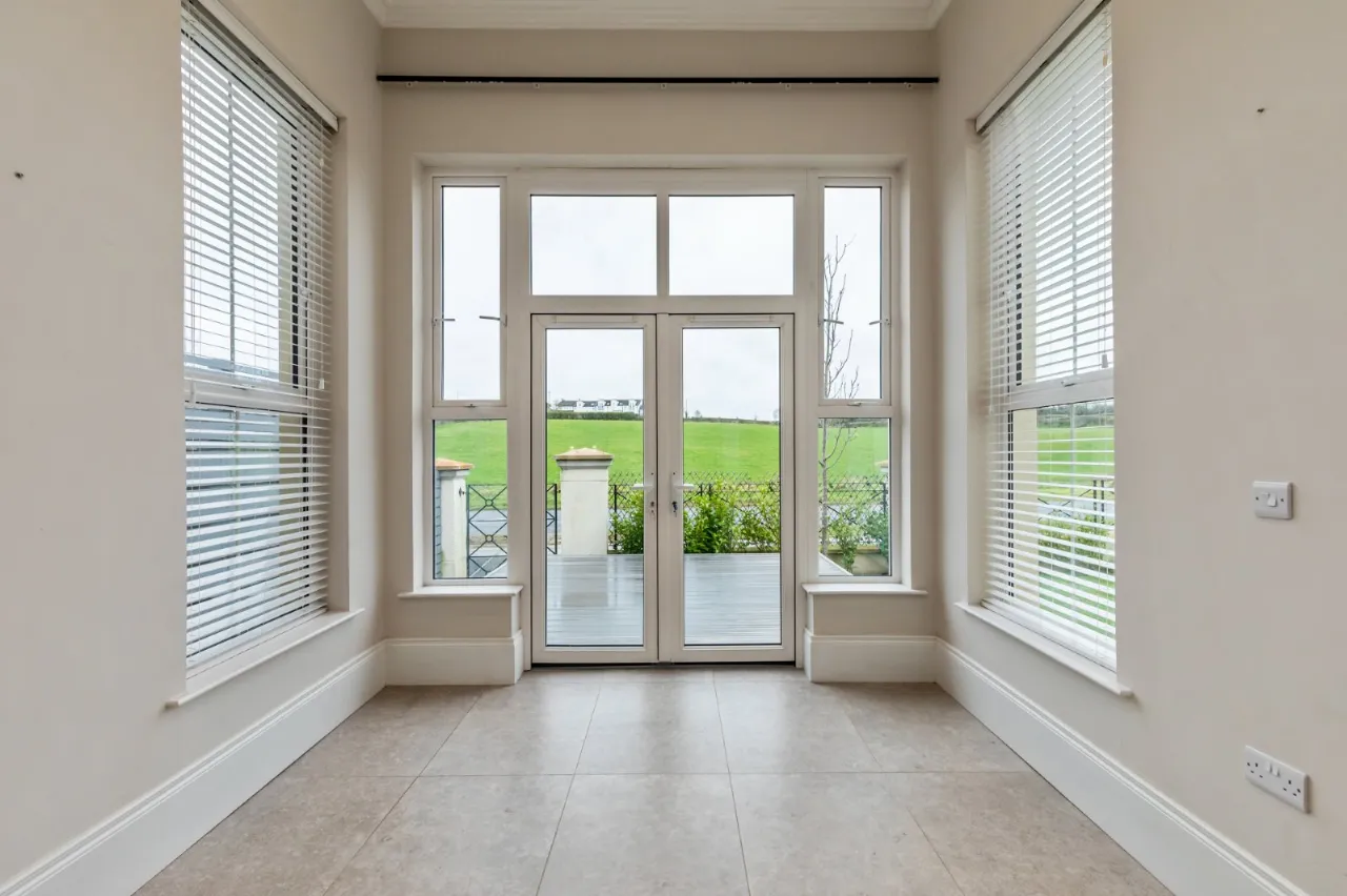 PVC front door, outside light.