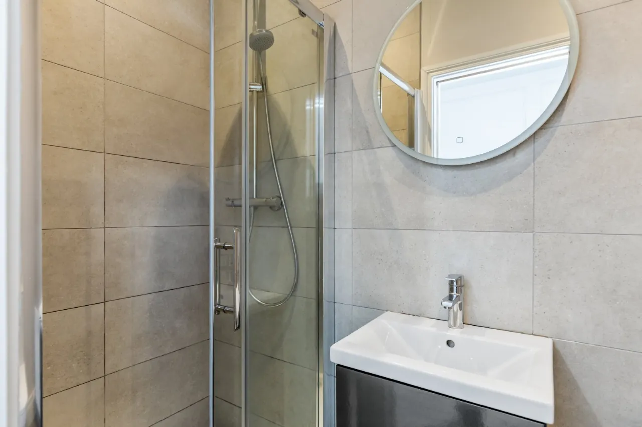 Low flush WC, wash hand basin with chrome mixer taps in vanity unit, fully tiled shower cubicle with chrome thermostatic shower unit.