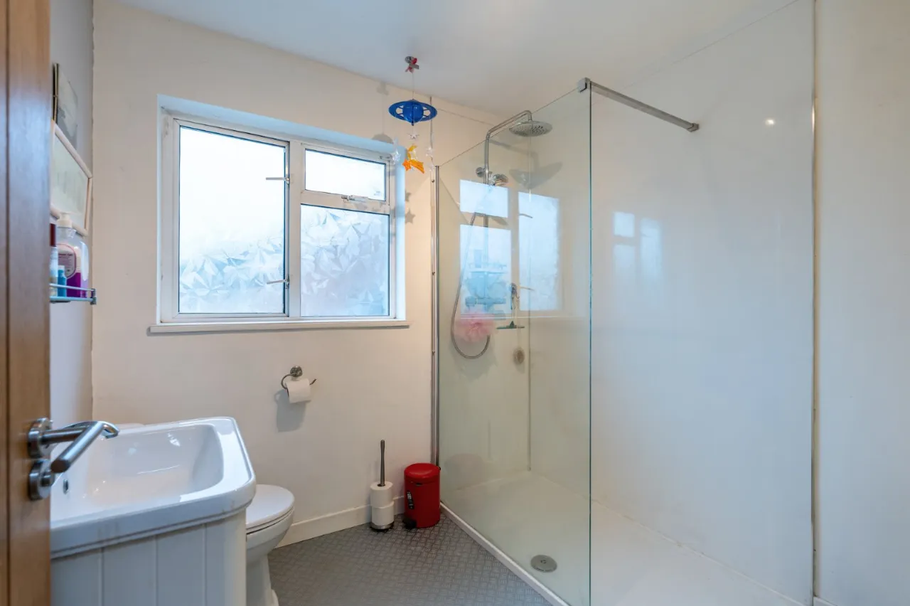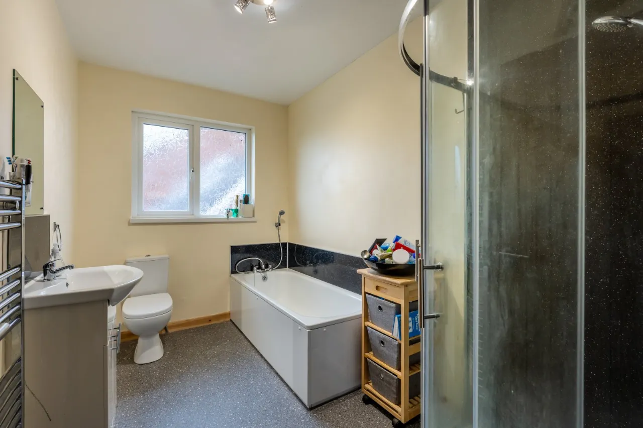 Wash hand basin in vanity unit, panelled bath with chrome mixer taps and telephone hand shower, low flush WC, shower cubicle with thermostatic sink unit, chrome heated towel radiator.