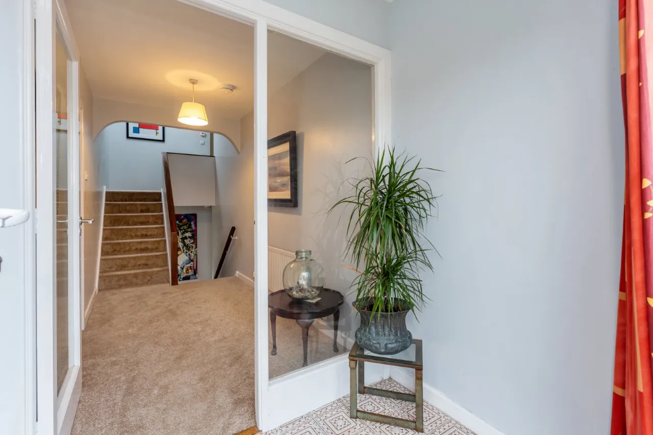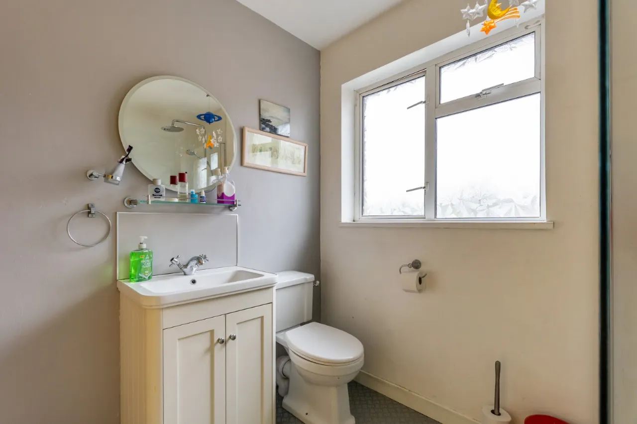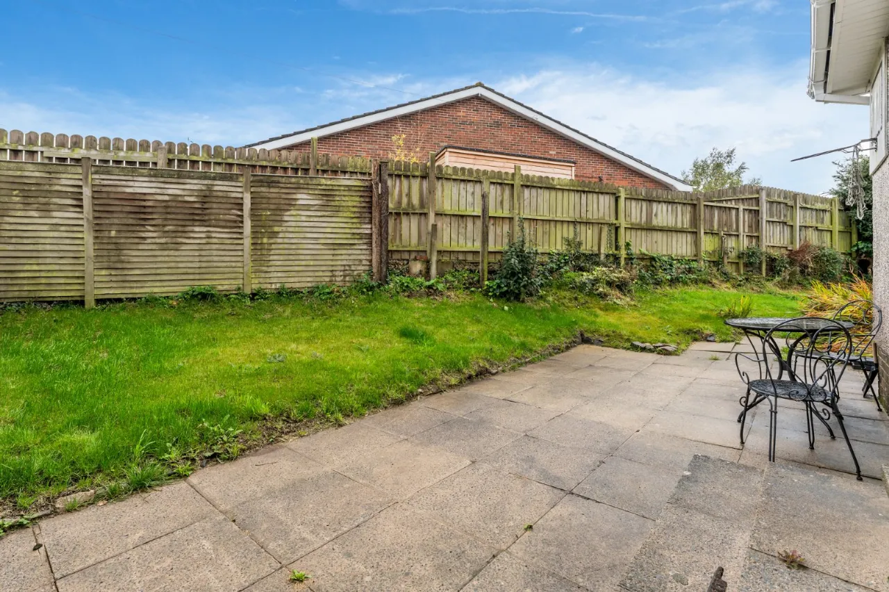 Good sized front and enclosed side and rear garden in lawns with shrubs, fruit trees and greenhouse. Driveway parking.