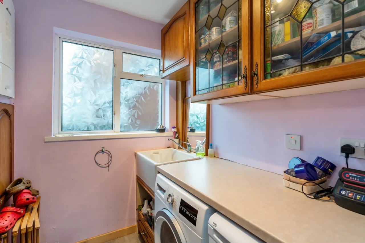 Laminate work surface, ceramic sink unit, plumbed for washing machine, gas fired boiler.