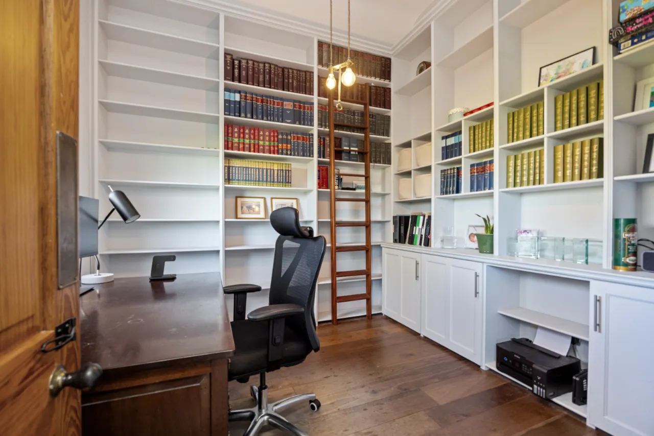 Excellent range of built in cupboards and bookcase shelving, access to roofspace. Solid wood flooring.
