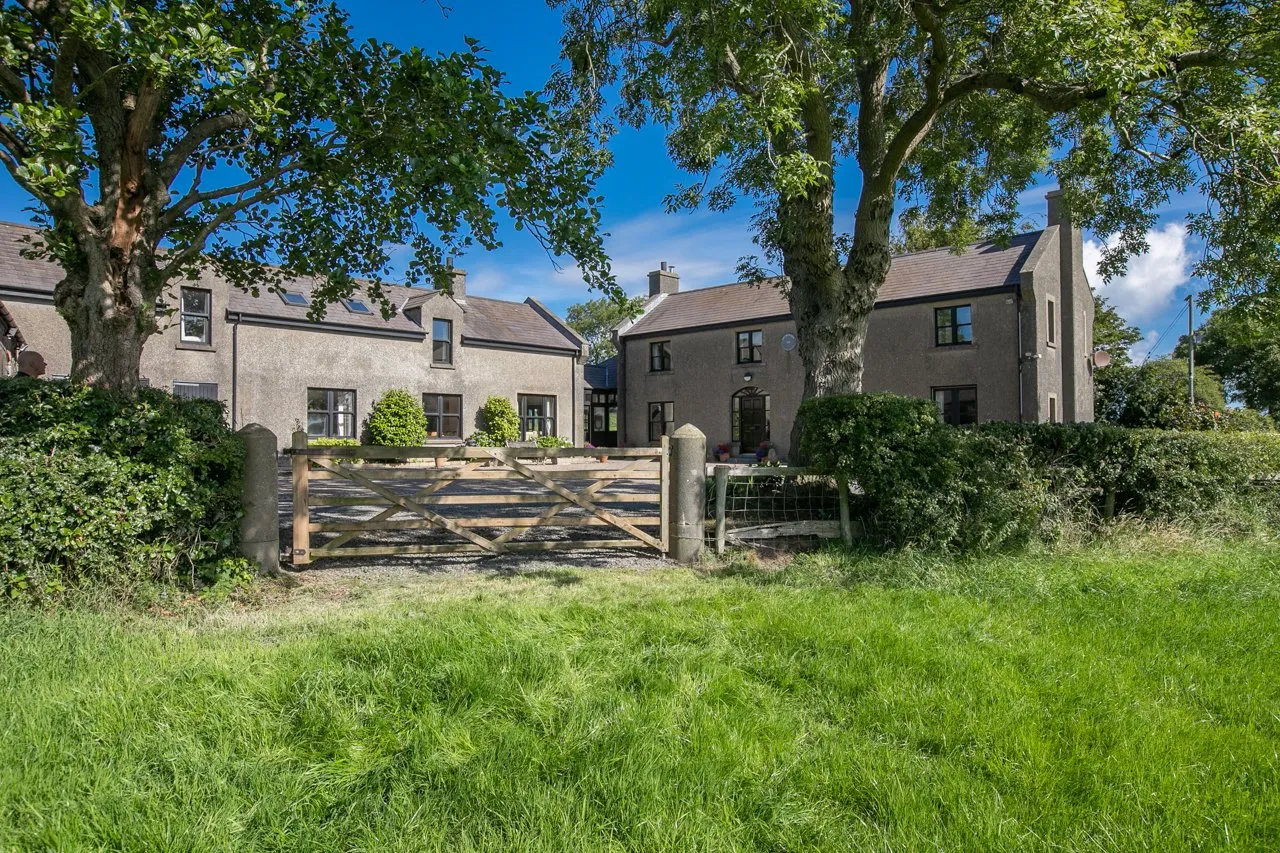 Inset Belfast enamel sink, antique style mixer taps, excellent range of solid oak high and low level cupboards, polished granite worktops, hardwood trainer, large irregular Donegal sandstone tiled floor, low voltage lighting, dark blue oil fired 2 oven Aga in tiled recess, Britannia oven and 4 ring gas hob, Ariston dishwasher. Space for dining table and chairs. Island unit with additional storage, partly tiled walls, recessed low voltage spotlighting. Double glazed door to sun lounge.