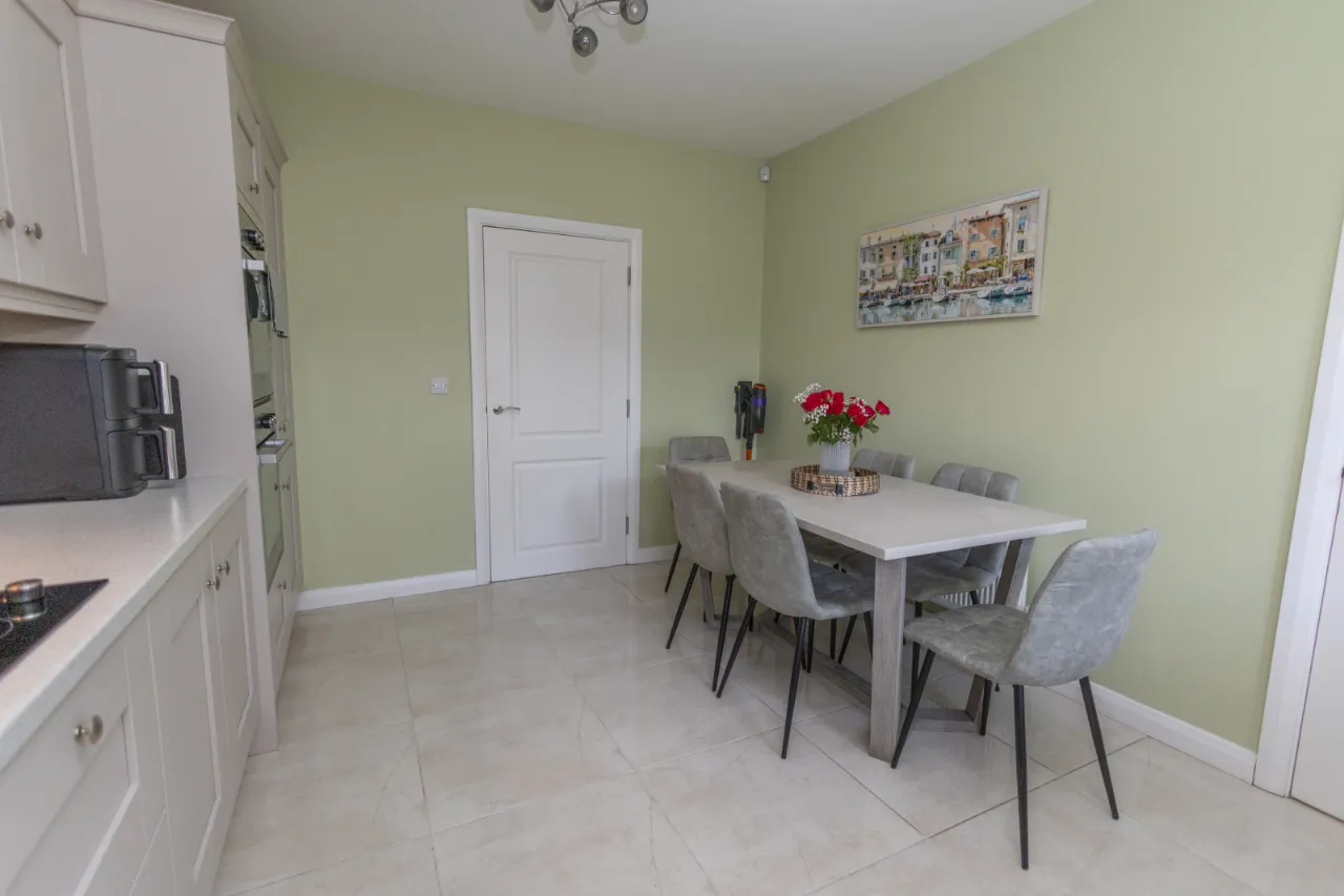 Kitchen / Dining Room with tiled flooring and upper and lower units with tiled splashback. Features a one-and-a-half bowl stainless steel sink and drainer. Integrated appliances include a fridge freezer, dishwasher, two ovens, and an electric hob with extractor hood above. Double radiator.