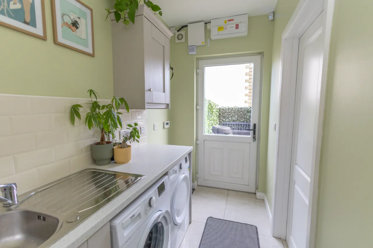 Utility Room with tiled flooring, upper and lower units with tiled splashback, and a one-bowl stainless steel sink and drainer. Plumbed for washing machine and tumble dryer. Single radiator.